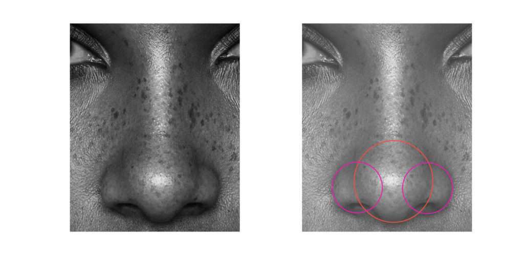 ▪︎ La taille et la forme des trous de nez varient en fonction de l’angle et de la position de la tête du sujet :