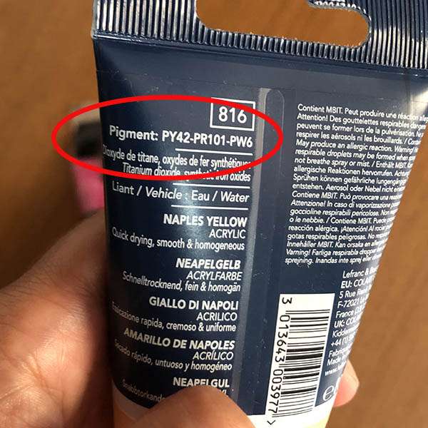 âȘïž Mais si votre couleur est rĂ©alisĂ©e Ă partir d’un mĂ©lange de plusieurs pigments, chacun dâeux sera mentionnĂ© sur le tube.