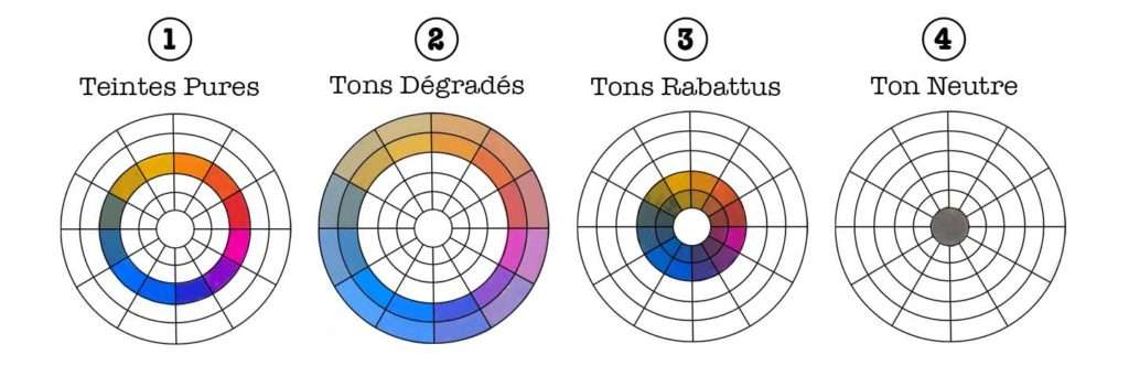 Au centre du cercle se trouve un ton neutre (qu’on appelle aussi la Boue), obtenu en mélangeant de façon homogène toutes les couleurs de votre Gamme.