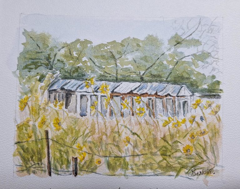 Joanaa. alors il faut que je vous explique, j’ai fait des pochades basiques à l’aquarelle, puis une que vous avez déjà vu il me semble dans mon carnet à idée, mon cercle est réalisé à l’aquarelle et j’ai fait un petit tableau 41×33 à l’huile travaillé dans le gamut donc, alors il comporte plus de détails que sur le travail de la maison devant la montage, j’espère ne pas être sujet….ce n’est pas la cabane du Gamut, mais la cabane abandonnée dans les jardins ouvriers, un petit clin d’œil à la cabane quand même…encore merci Joanaa .