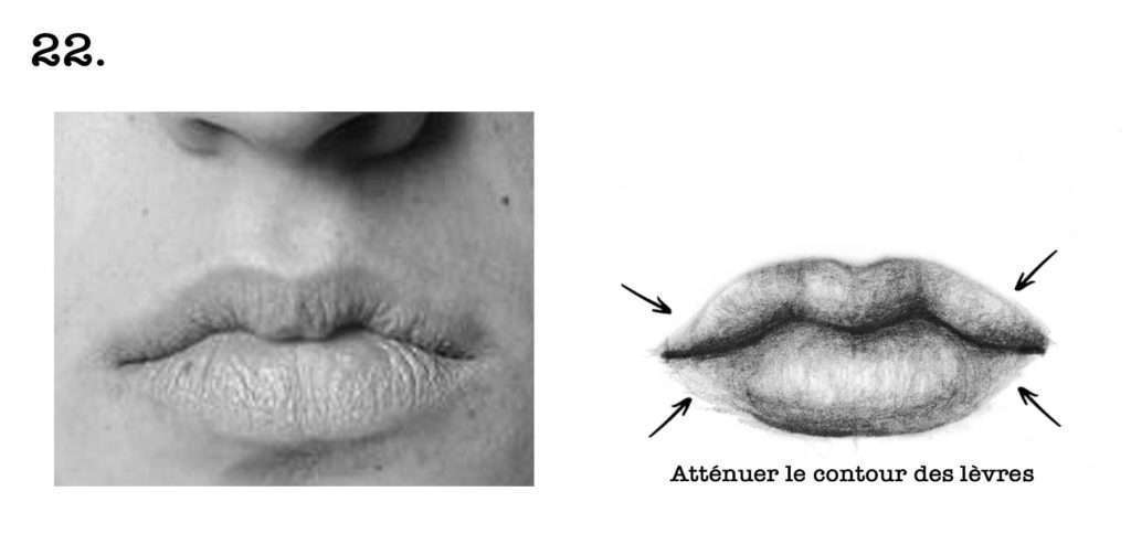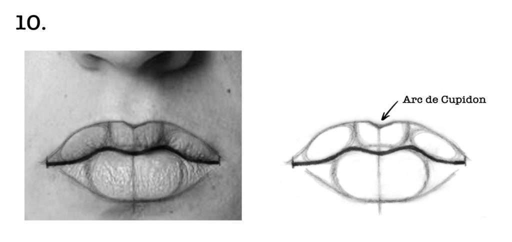 ▪︎ Foncez les creux de la lèvre supérieure. (Vous voyez, il s’agit des espaces hors ballons qui sont des creux et non des bosses).