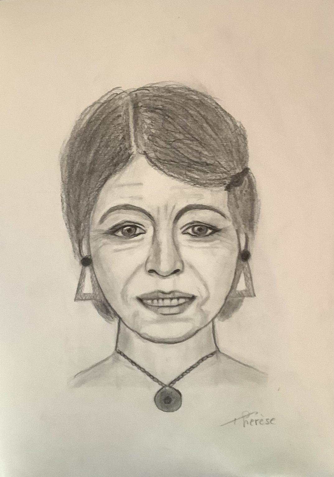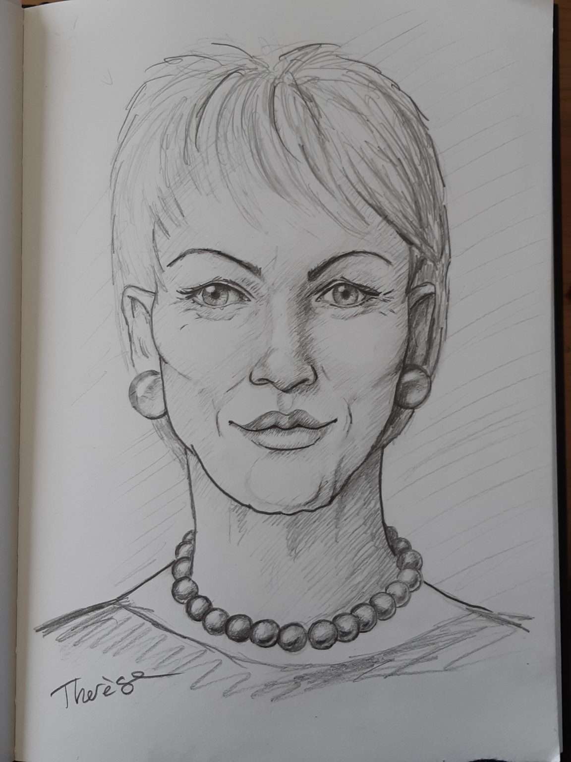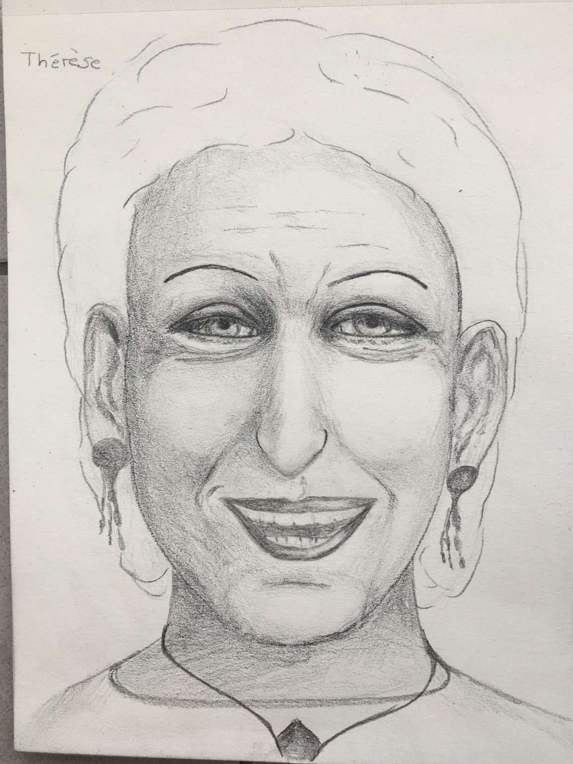 Voici Thérèse, rieuse, pimpante. La difficulté a été de faire le portrait d’une femme d’une soixantaine d’années car je la trouvais toujours trop jeune. J’ai ajouté des rides autour des yeux et bouche. Il y a t’il une technique pour vieillir les personnes, des traits bien précis?