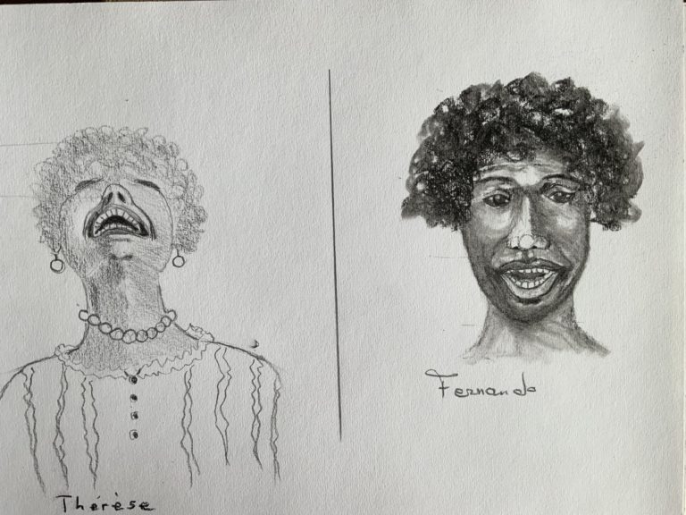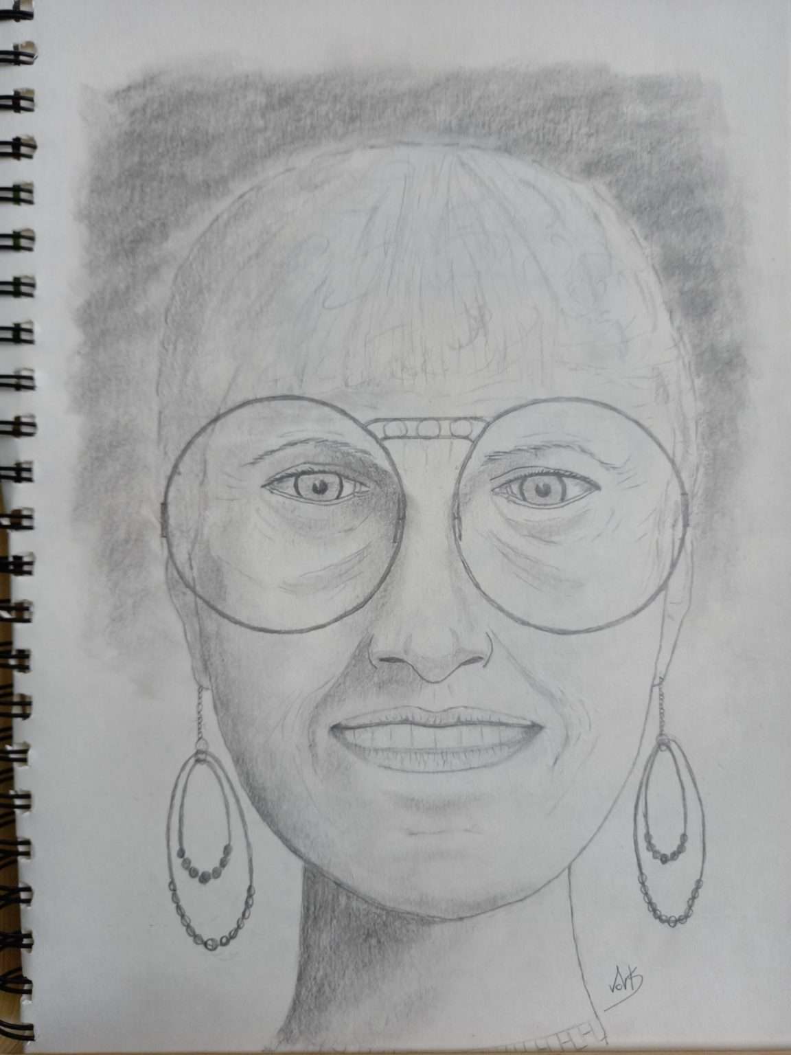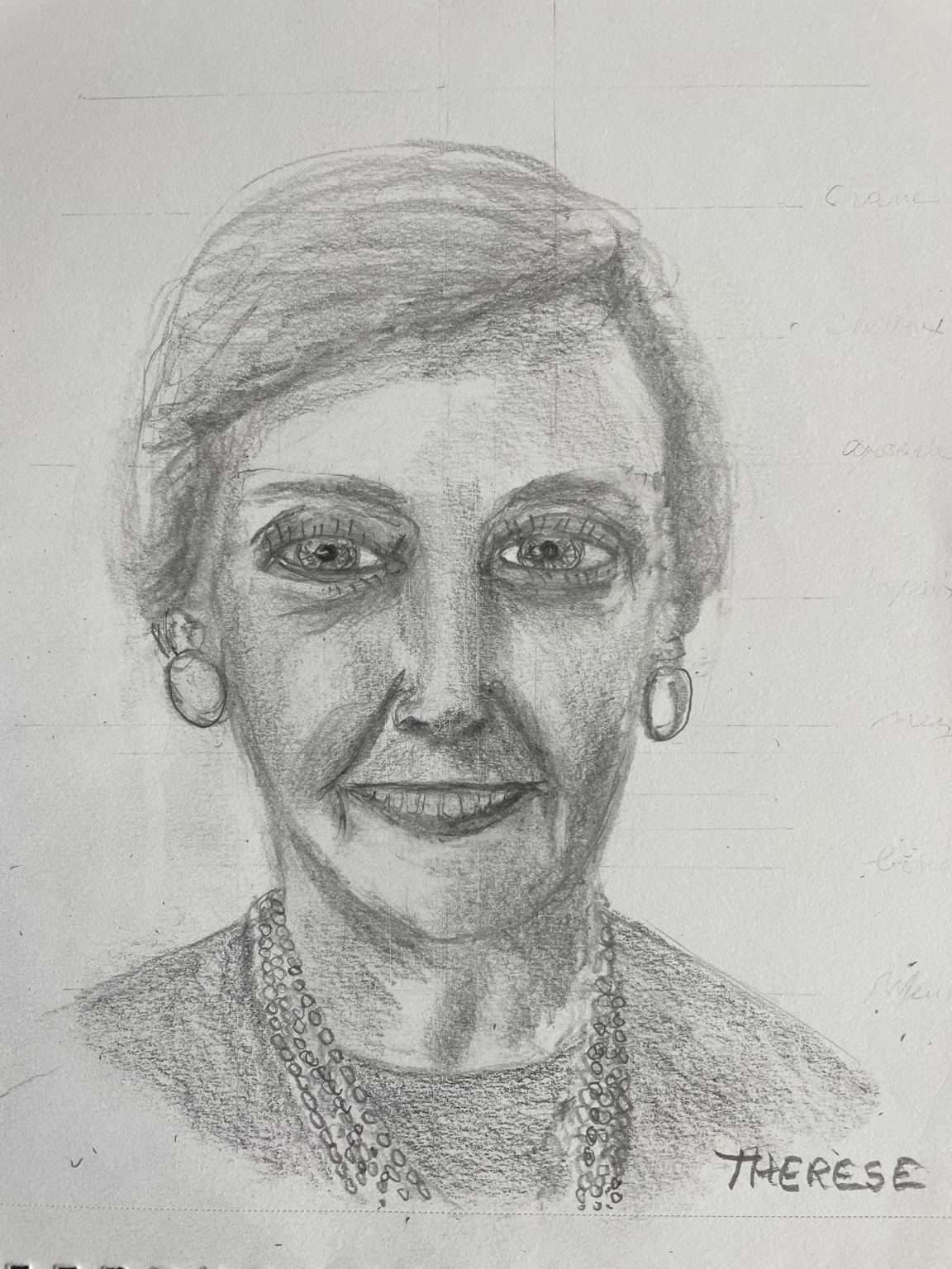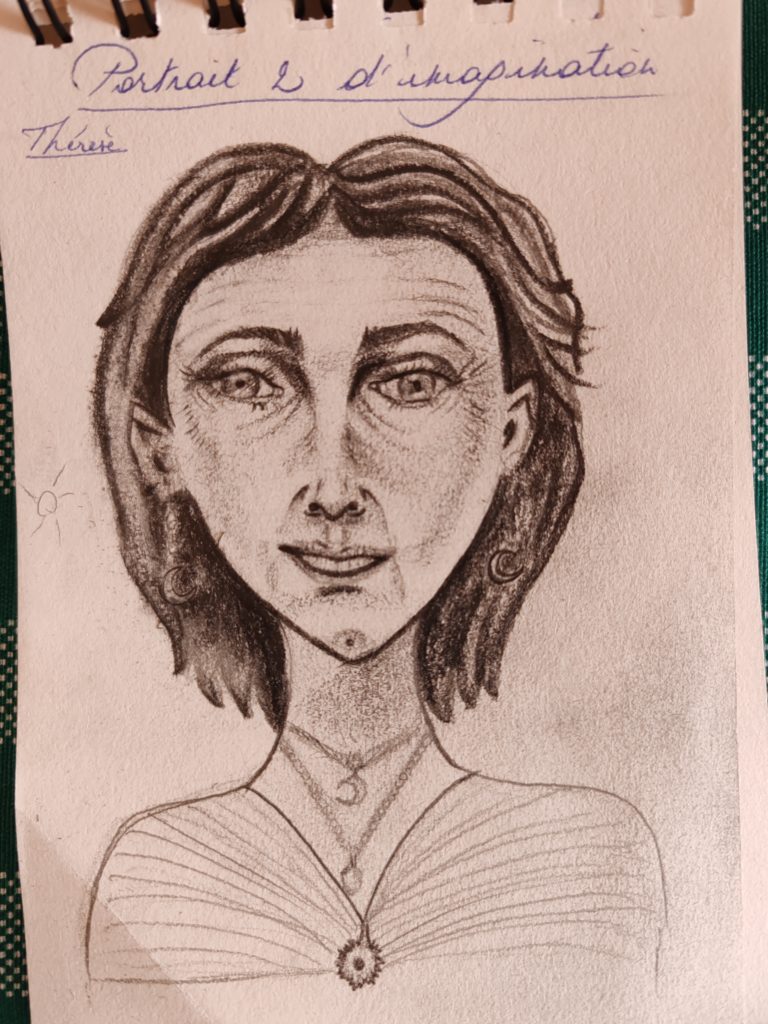 Voici Thérèse, rieuse, pimpante. La difficulté a été de faire le portrait d’une femme d’une soixantaine d’années car je la trouvais toujours trop jeune. J’ai ajouté des rides autour des yeux et bouche. Il y a t’il une technique pour vieillir les personnes, des traits bien précis?