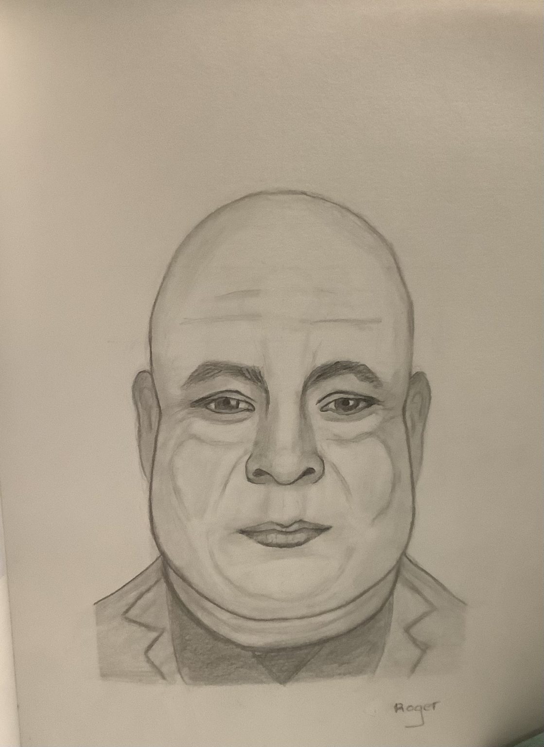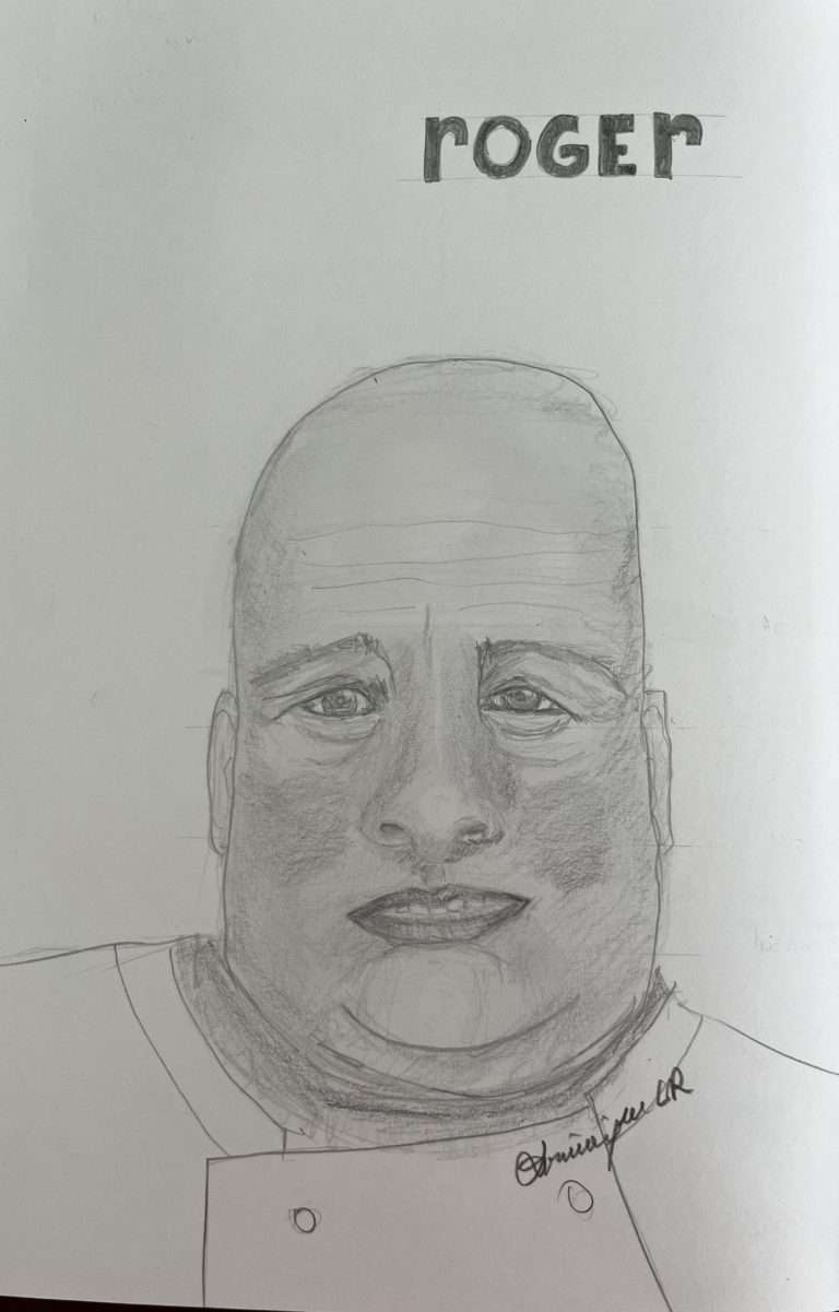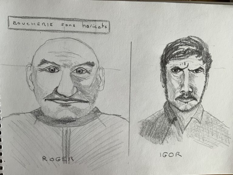 J’ai croisé ce visage à la cantine, je me suis dit qu’il conviendrait pour dessiner le visage de ROGER le boucher et me suis mis à l’ouvrage. Un brin de couleur, c’est plus fort que moi. A bientôt .