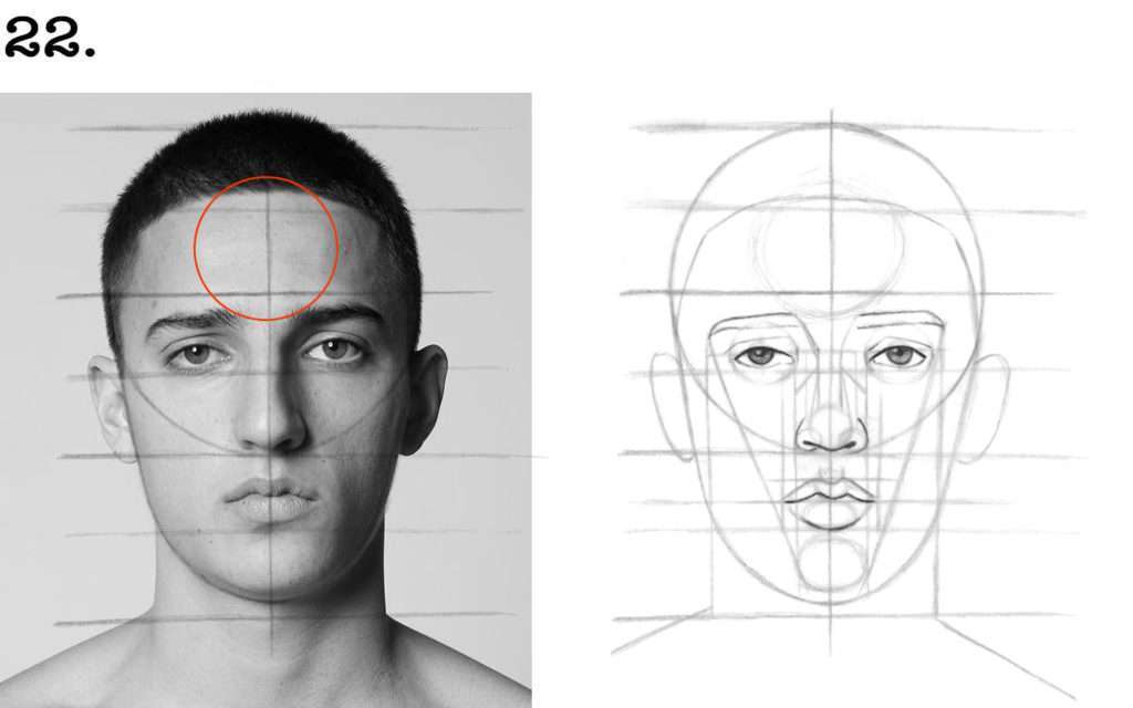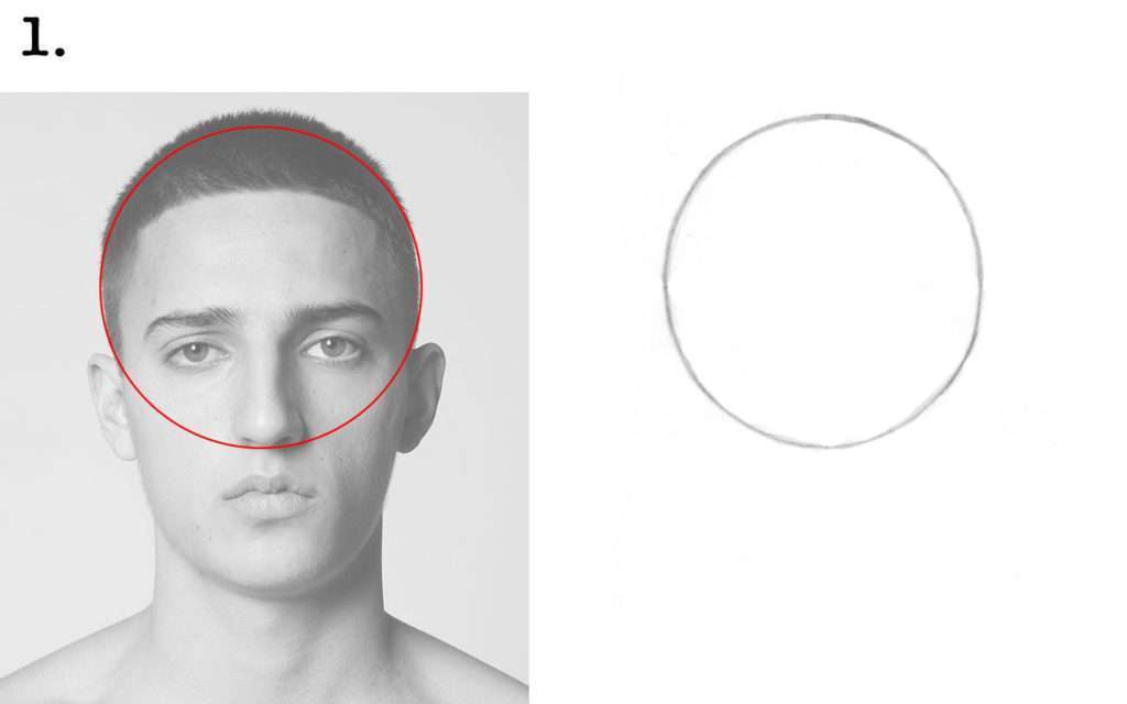 ➜ Pour cela, esquissez un cercle allant du haut des sourcils jusqu’au-dessus de l’implantation des cheveux.