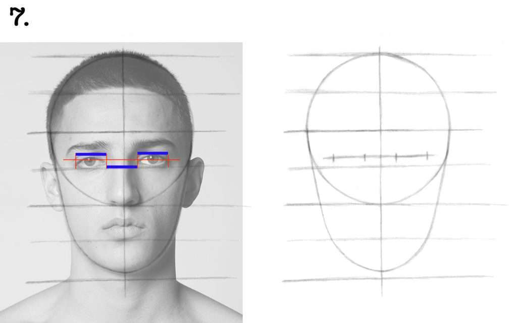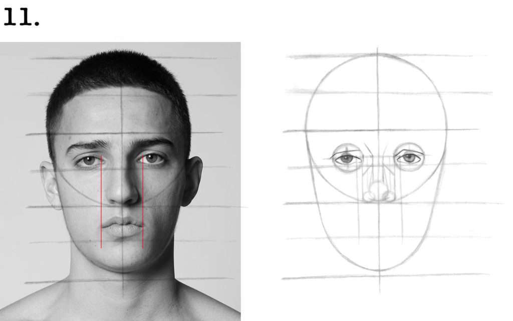 ✔︎ Profitons-en pour tracer deux repères verticaux qui descendront des coins des yeux jusqu’à la ligne du Nez.