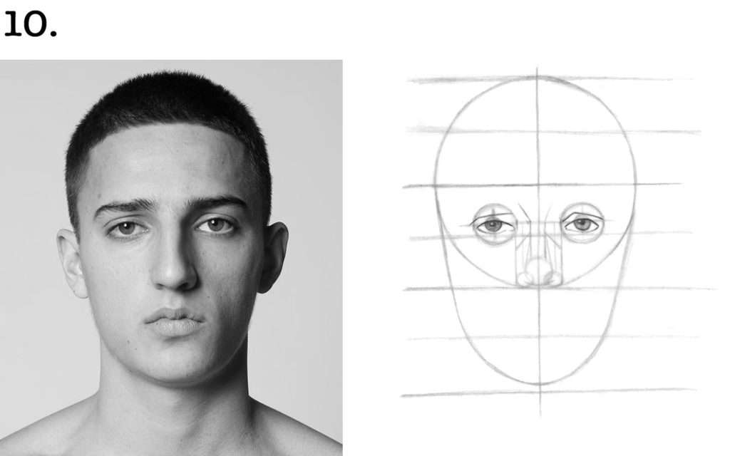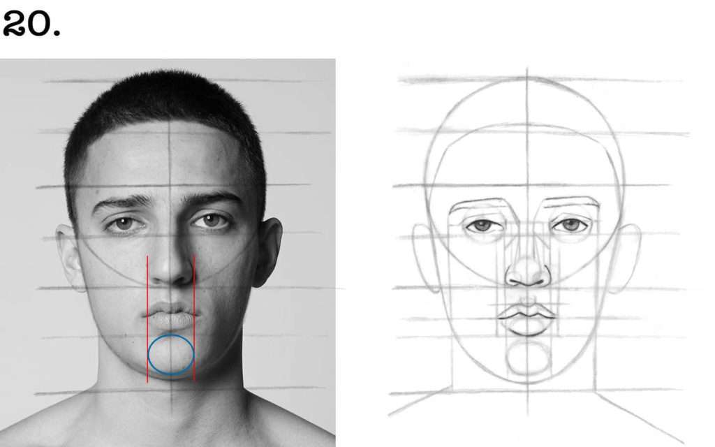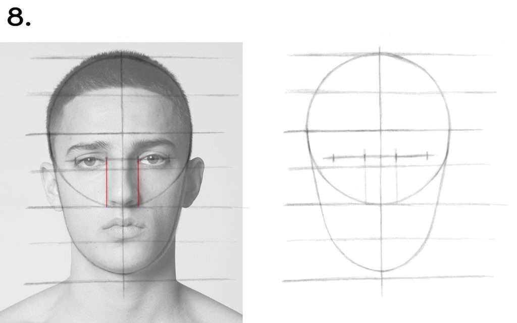 ➜ Pour cela, tracez deux droites verticales ayant la même largeur que le nez du modèle et qui descendent jusqu’au niveau du menton.