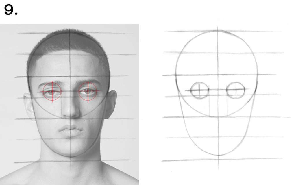 ✔︎ Ceci étant fait, nous pouvons à présent prendre un peu de temps pour dessiner la forme globale de nos yeux en appliquant la méthode vue dans les leçons précédentes.