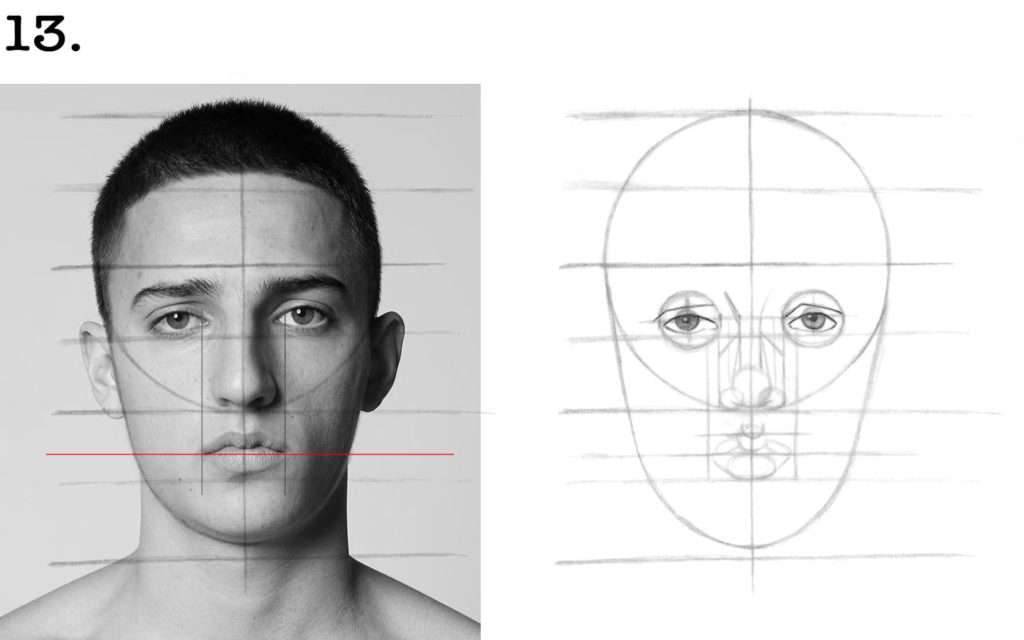 ✔︎ Traçons maintenant la ligne de repère horizontale qui nous permettra de construire notre bouche.