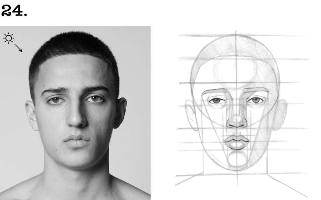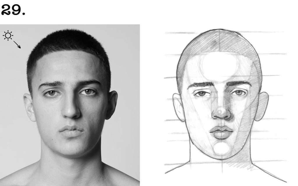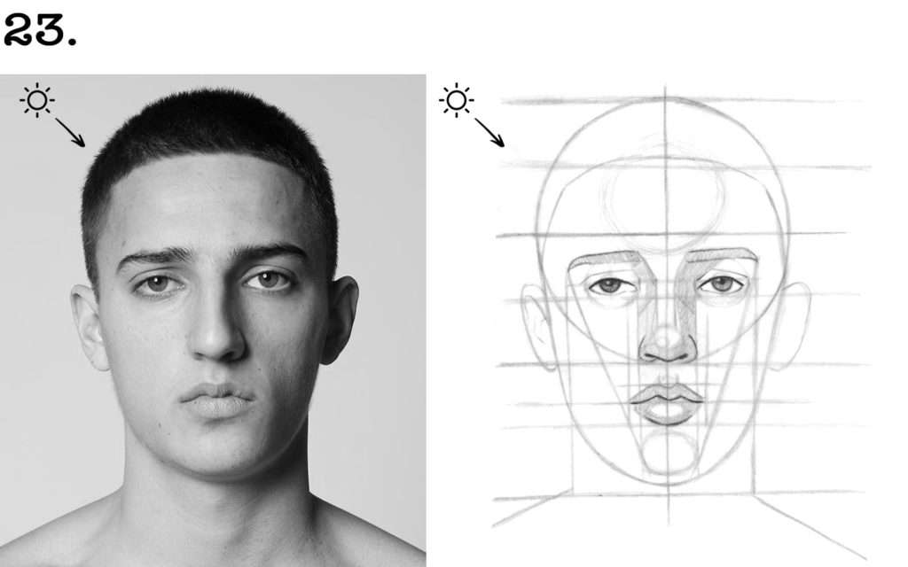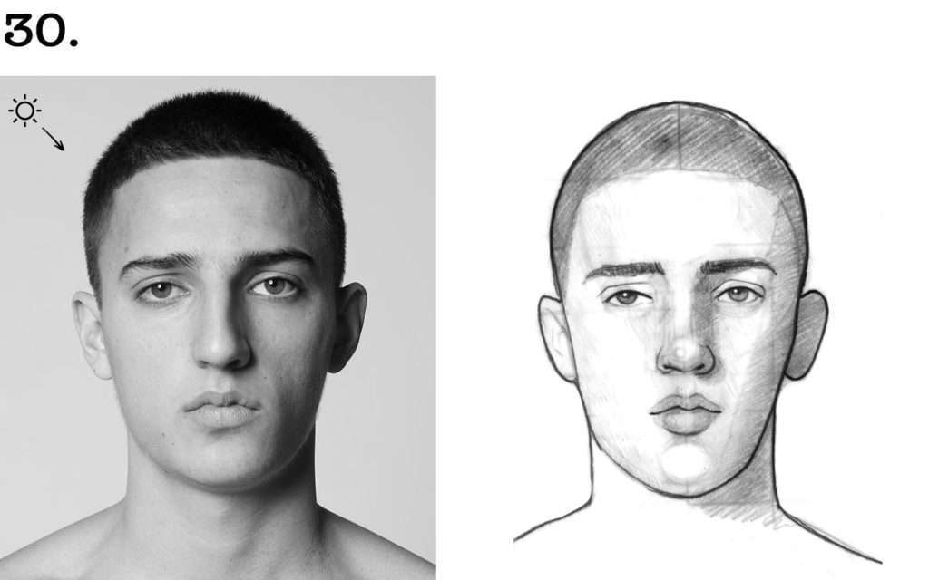 ✏️ Puis, venez ombrer la zone droite du visage qui est dans l’ombre.