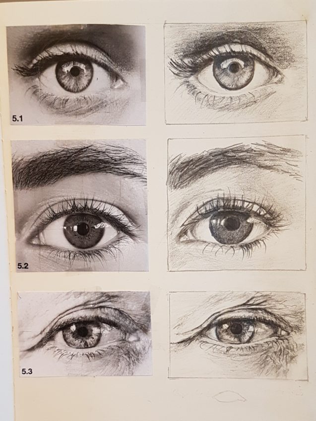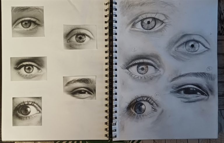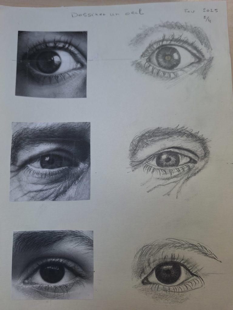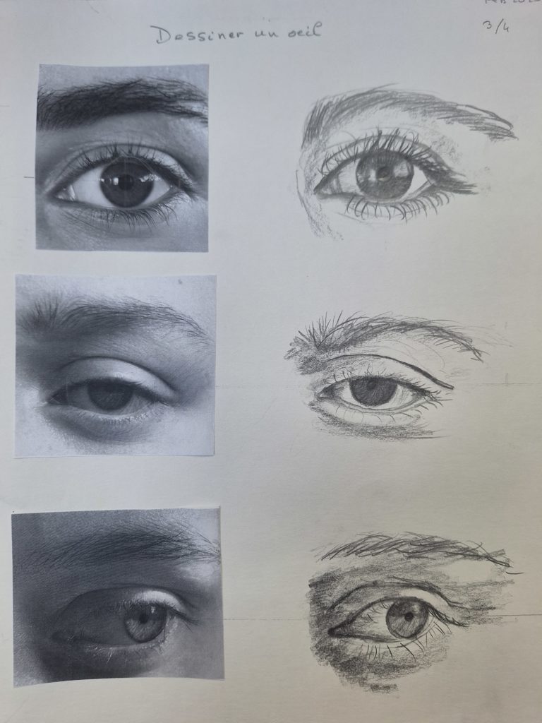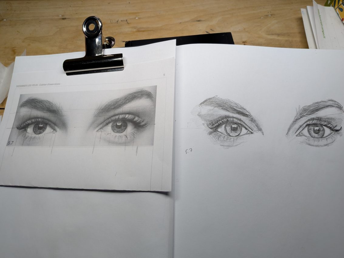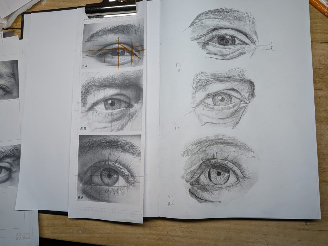Voici les esquisses réalisées sur les yeux. En effet, c’est en pratiquant que l’on intègre la technique.