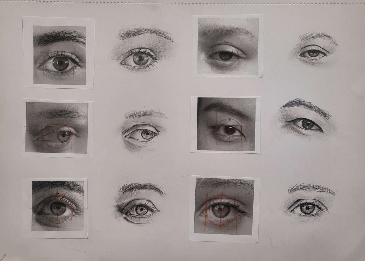 Voici ma copie des 12 yeux, j’ai calculé environ 30 mn par œil puis une correction le lendemain pour regarder avec un ”oeil” neuf. Lol !