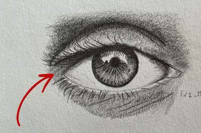 Attention à l’œil droit : la ligne sur le globe oculaire, au-dessus de la paupière du bas, est un peu trop marquée, ce qui creuse un peu trop l’oeil (vous pouvez l’atténuer légèrement avec une gomme mie de pain).