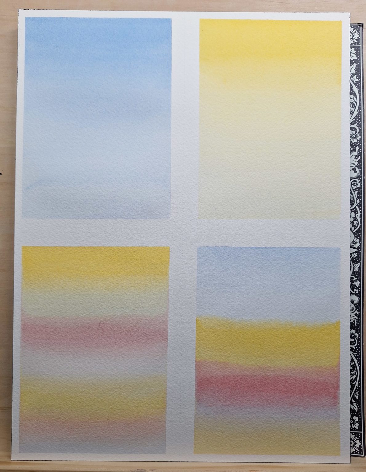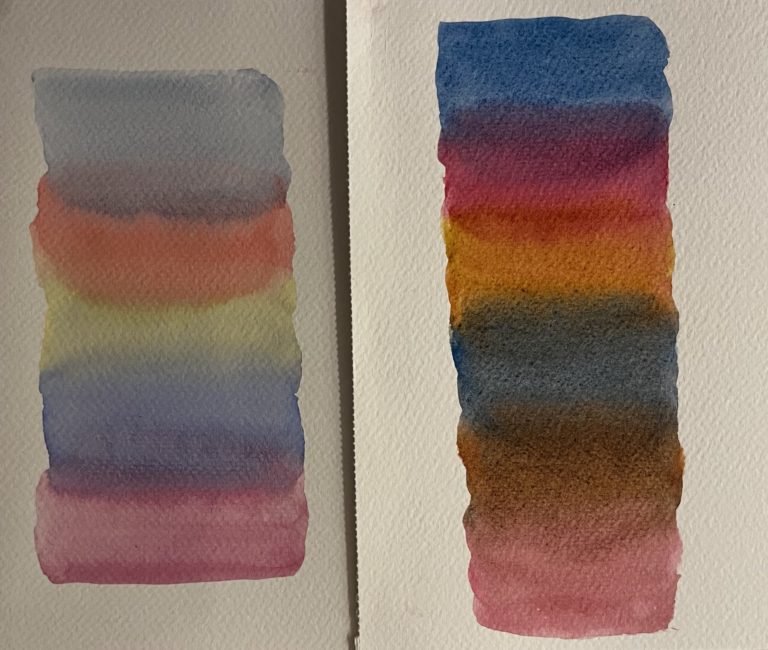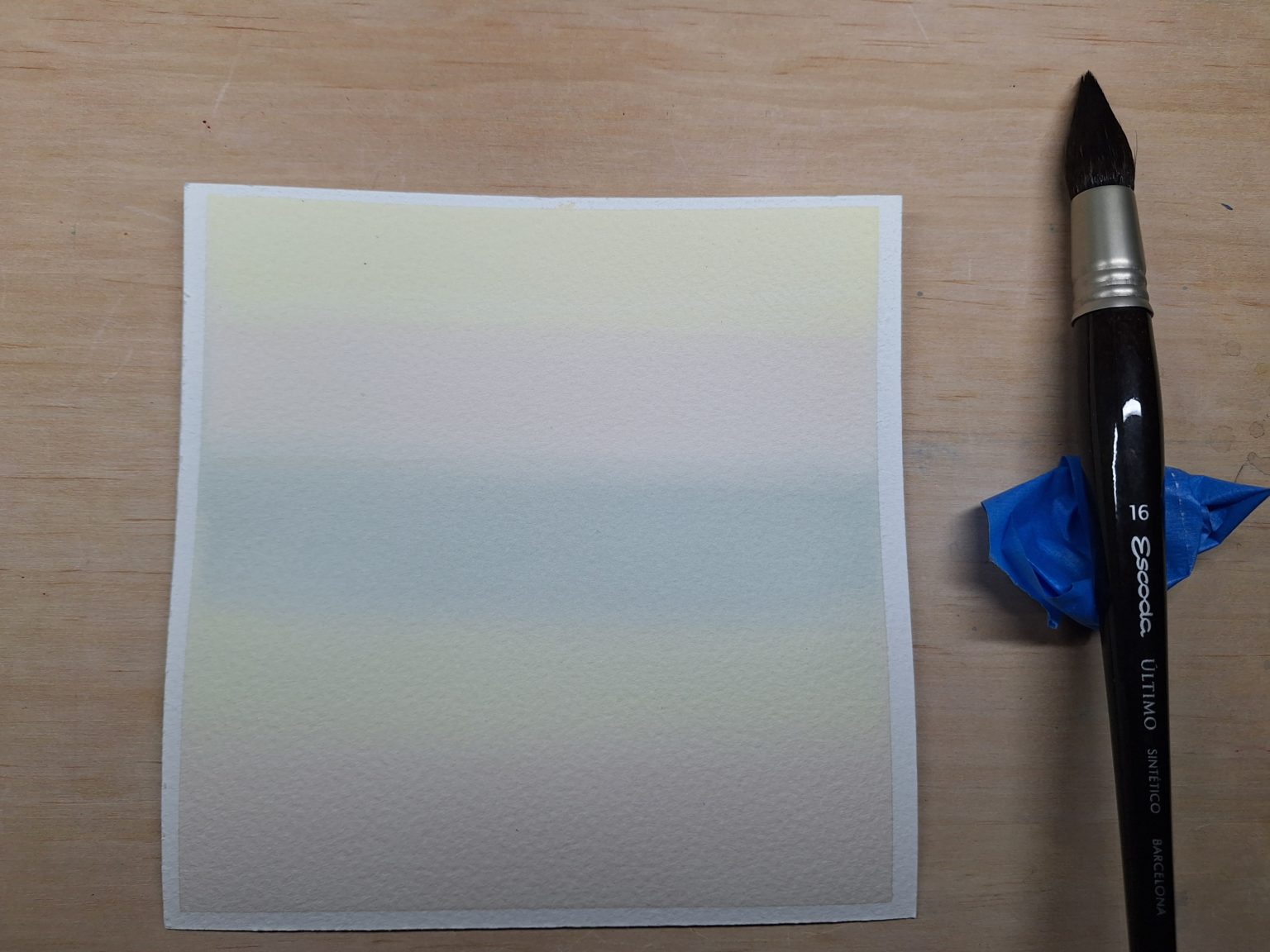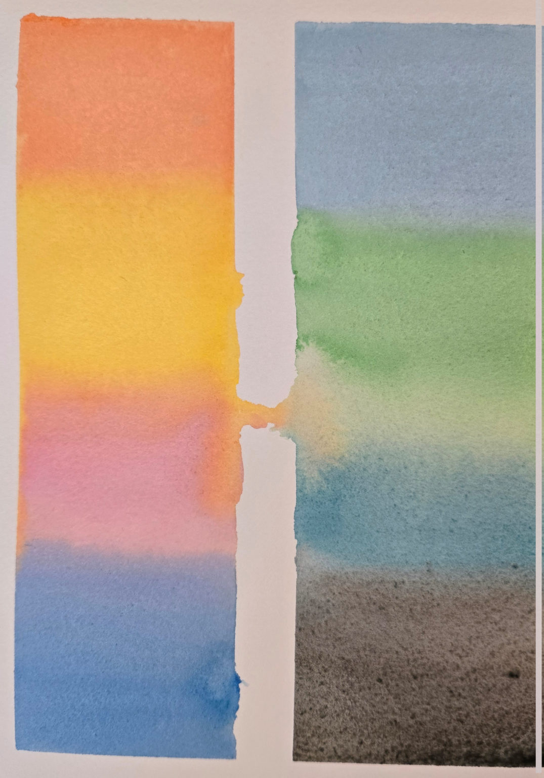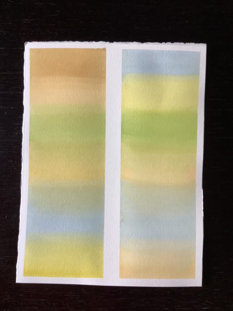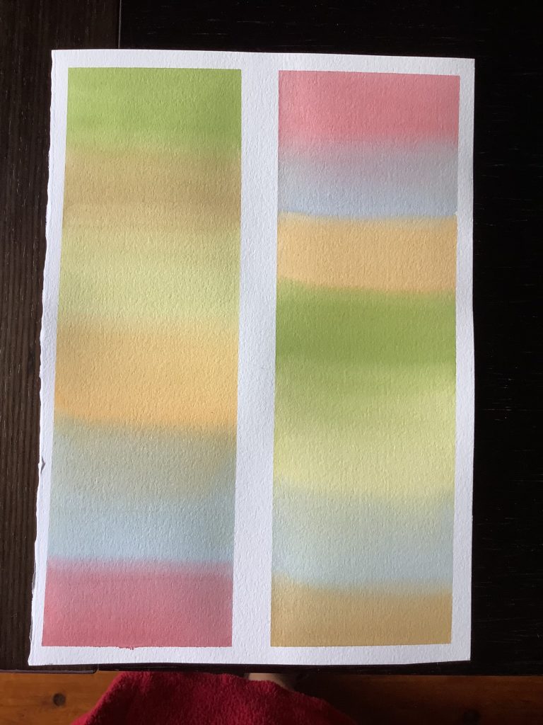 Voici mes meilleurs rĂ©sultats pour les lavis couleurs. Ce n’est pas Ă©vident du tout de ne pas faire une lĂ©gĂšre ligne de dĂ©marcation entre les 2 couleurs. Le temps de bien rincer le pinceau et une petite quantitĂ© de pigments s’est dĂ©jĂ  incrustĂ© profondĂ©ment dans le papier, mĂȘme en repassant dessus la ligne reste visible. Joanna faut il humidifier avant le papier pour Ă©viter cela? Mais la goutte sera alors plus difficile Ă  maĂźtriser non?