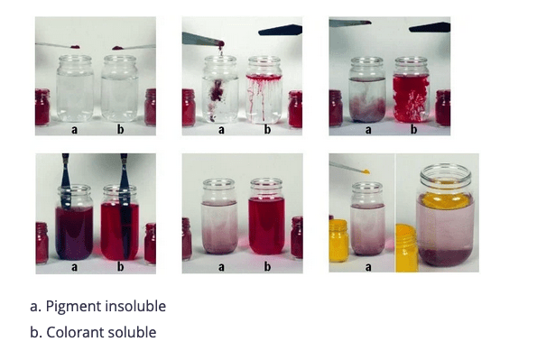 â–Ș Le pigment, lui, se disperse dans le milieu qu’il colore sans s’y dissoudre, il est INSOLUBLE.
