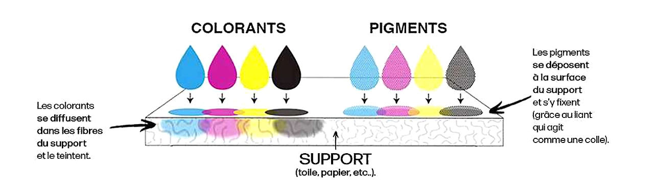 ➜ La grande diffĂ©rence du pigment est qu’il va venir se dĂ©poser Ă  la surface du support sur lequel on l’applique et s’y fixer (grĂące au liant qui agit comme une colle).