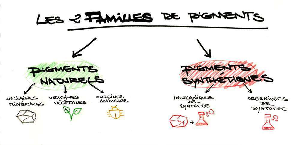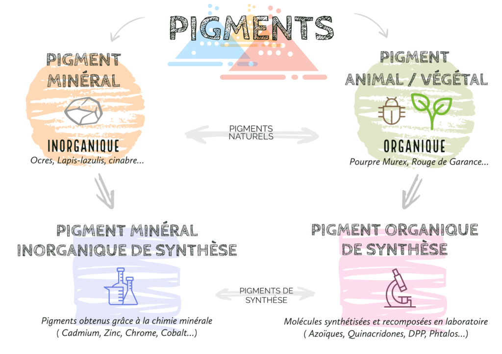 Il existe plusieurs types de pigments issus d’origines et de familles différentes.