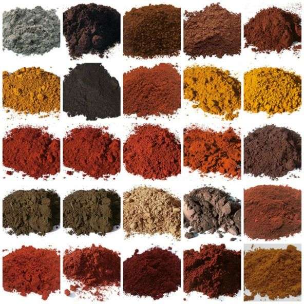 ✔︎ Ce sont les fameuses roches, terres, ocres, et autres oxydes de fer et de cuivres naturels récupérés quasiment bruts dans la nature et broyés en fine poudre.