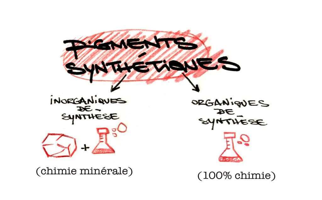 ✔︎ Les pigments de synthèse issus de la chimie minérale sont obtenus après un traitement chimique de certains minéraux.
