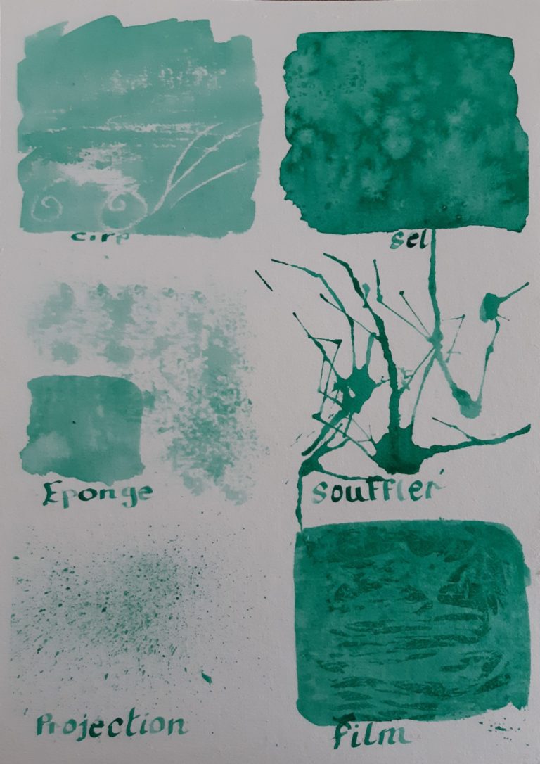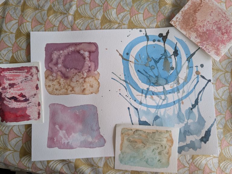 → Pour le sel, le rĂ©sultat va dĂ©pendre du degrĂ© d’humiditĂ© de votre papier lorsque vous le dĂ©posez sur la couleur. D’aprĂšs mes essais, il semble aussi que le type de sel ainsi que la grosseur des grains contribuent Ă  faire varier les effets.