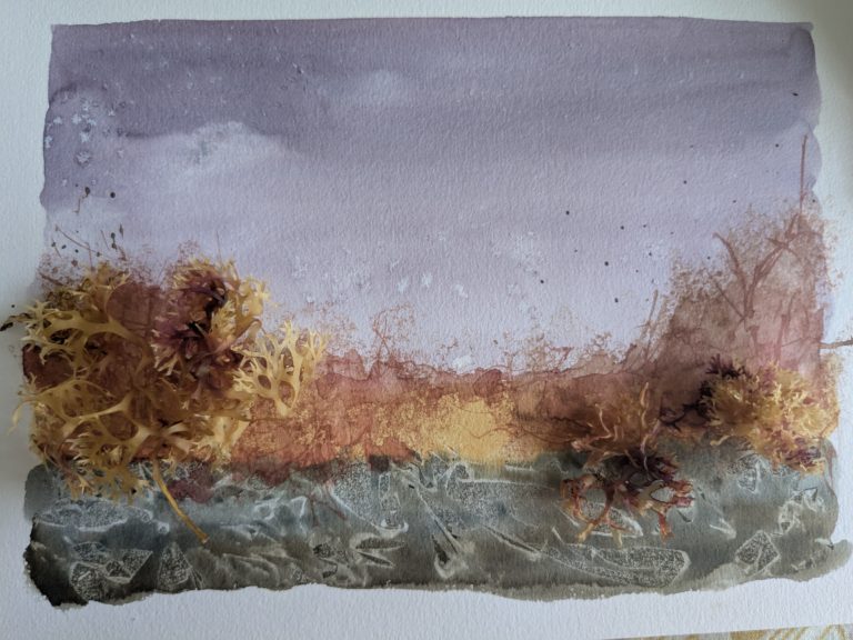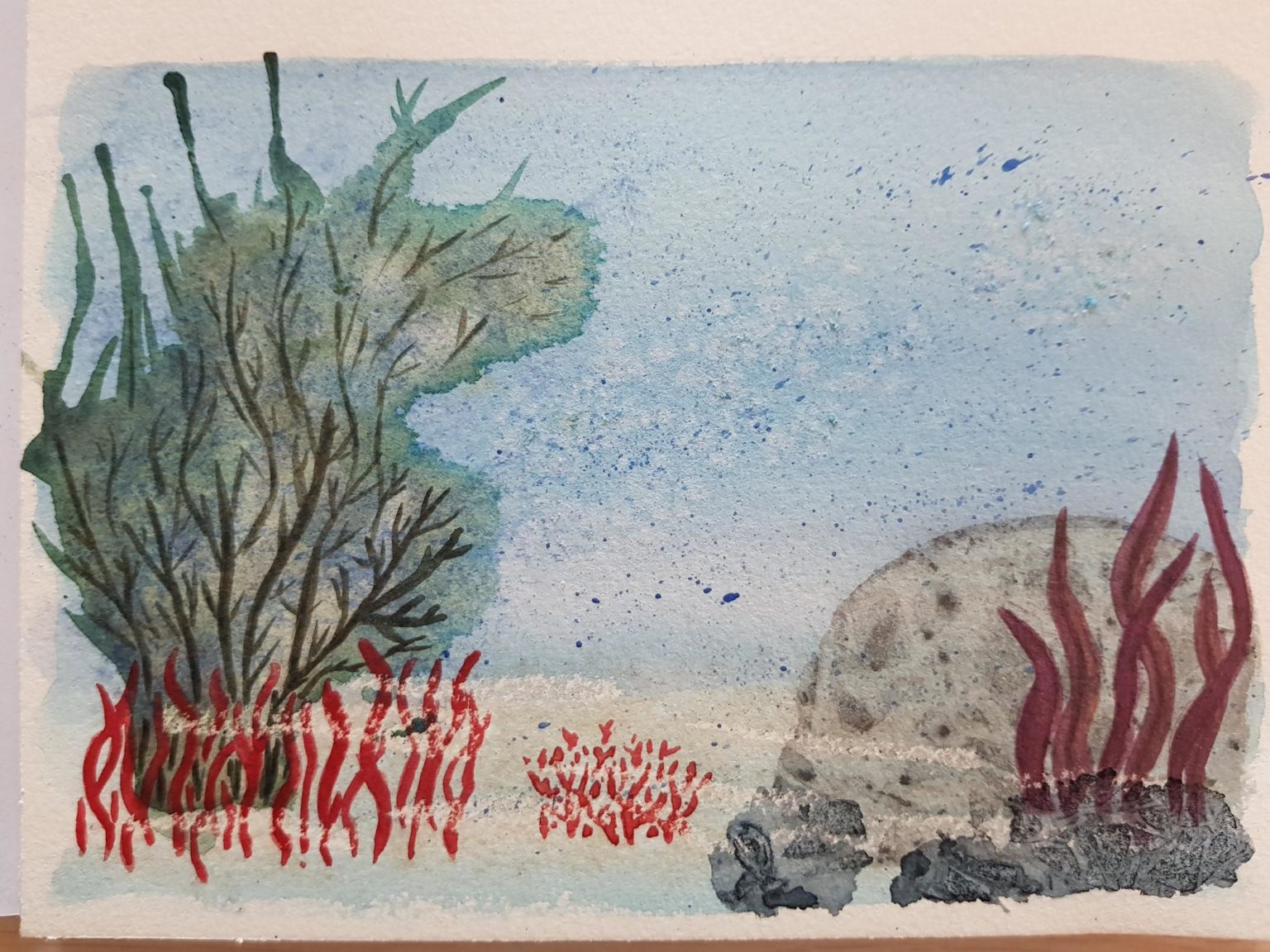 J’y ai testĂ© la cire pour crĂ©er des vagues sur le bas, le cellophane pour crĂ©er les rochers, l’Ă©ponge pour faire la premiĂšre couche de sable et un passage avec du bleu sur la plante verte, laquelle a Ă©tĂ© soufflĂ©e (pas facile sans paille !) et j’ai ajoutĂ© du sel et des projections sur la zone bleue pour crĂ©er des mouvements d’eau.