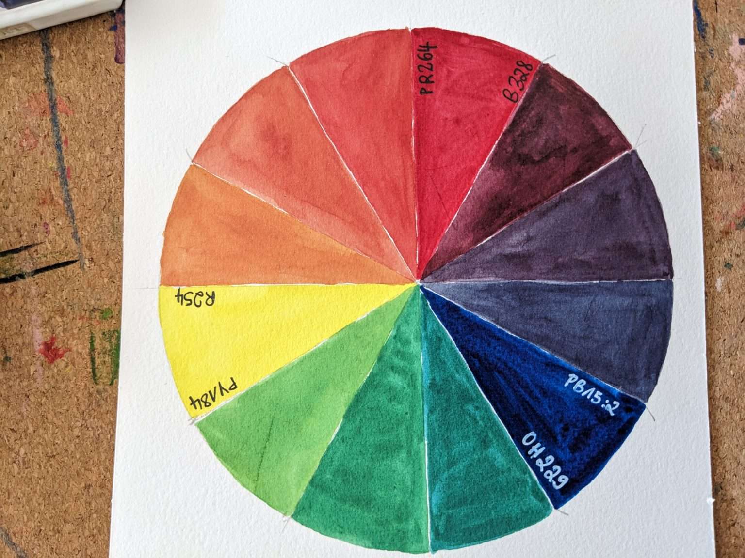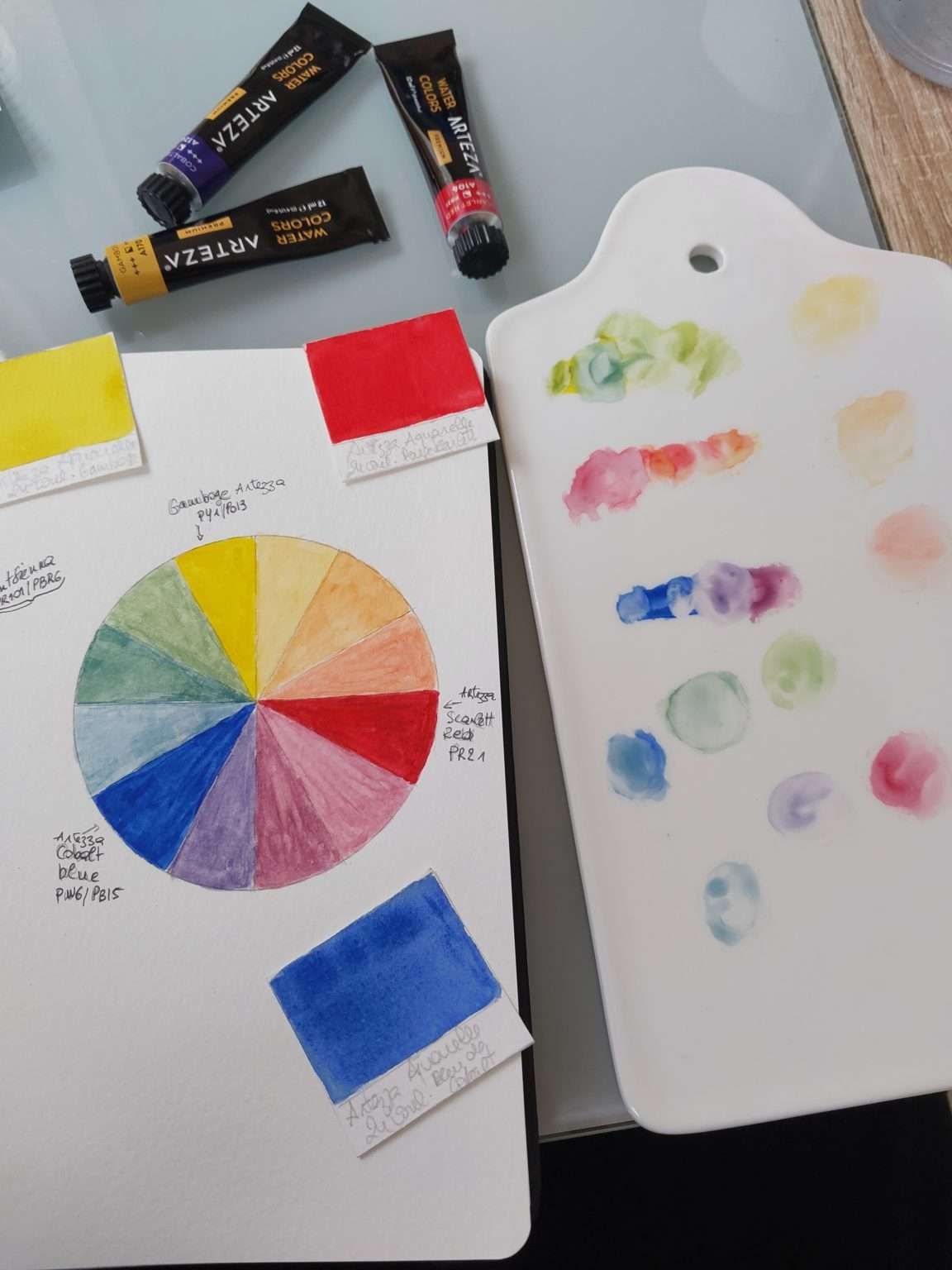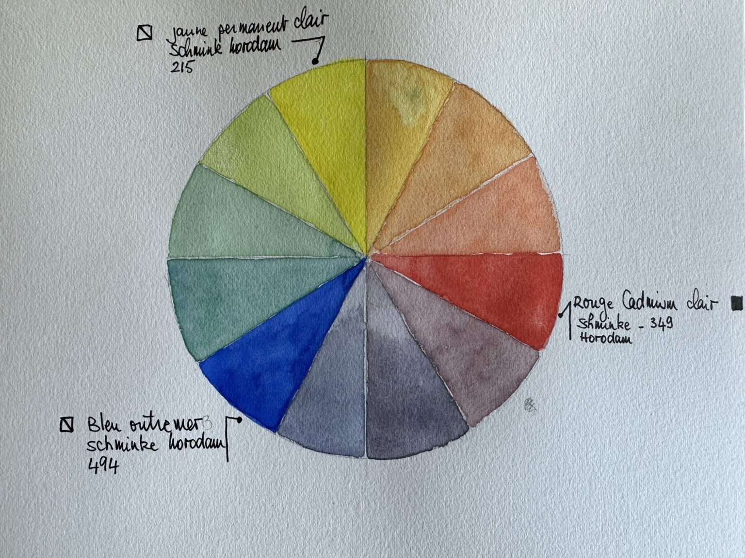 Bonjour Joana, voici mon cercle chromatique à l’aquarelle Schmincke Horadam. Le resultat me paraît terne et trop foncé, je compte réessayer bientôt avec d’autres couleurs et ou marques.