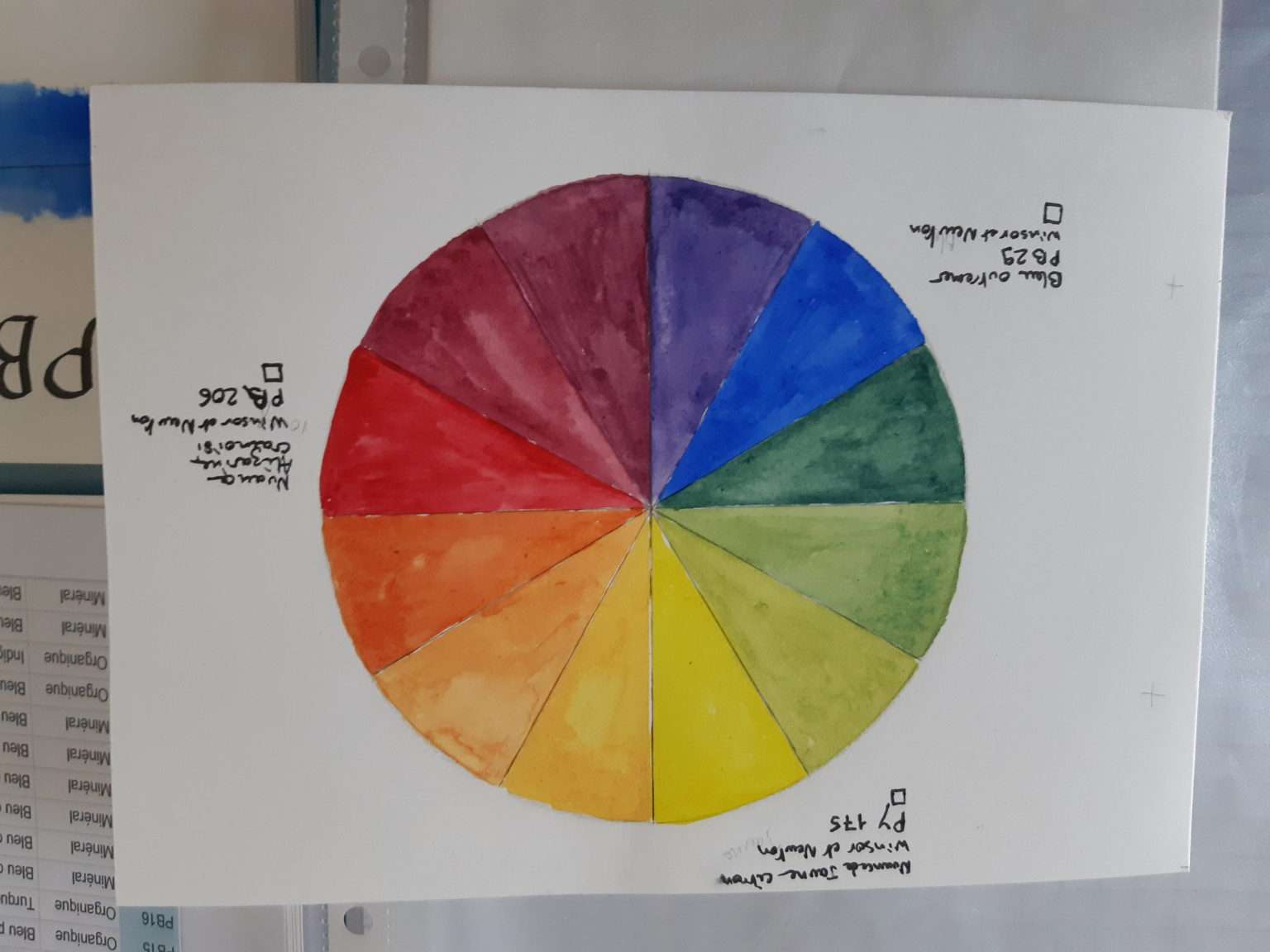 Voici le cercle chromatique réalisé à l’aquarelle avec un petit pinceau pour concentrer les pigments. Le rendu serait sans doute meilleur au pinceau mouilleur. A tester pour les prochains cercles!