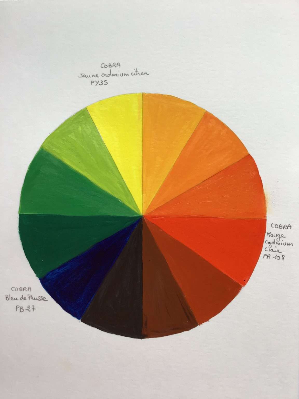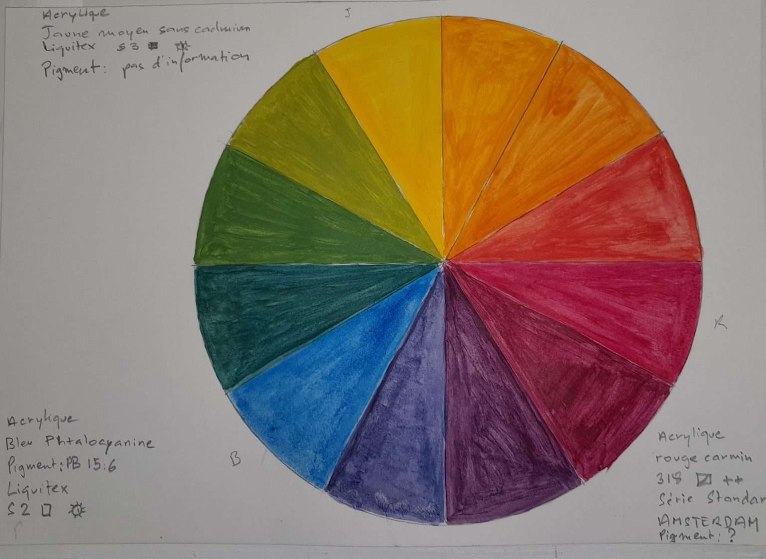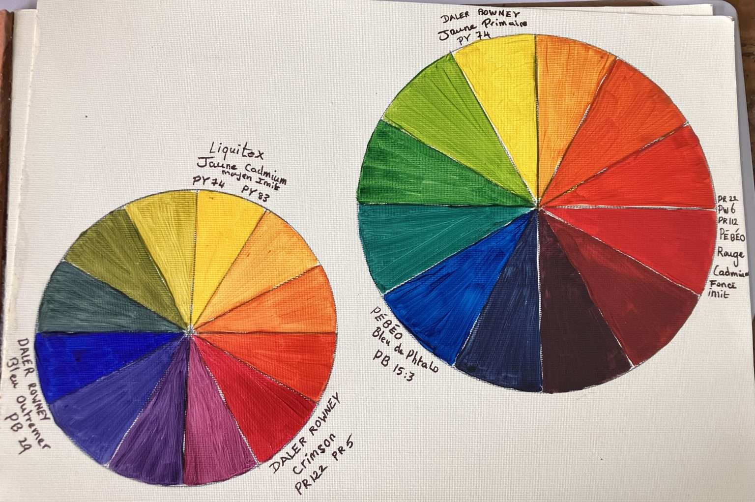 Je mets en pj le cercle chromatique que j’ai réalisé. L’exercice est intéressant. J’ai choisi de le faire avec de l’acrylique. L’application n’est pas terrible sur le papier mais j’aime bien les mélanges obtenus.