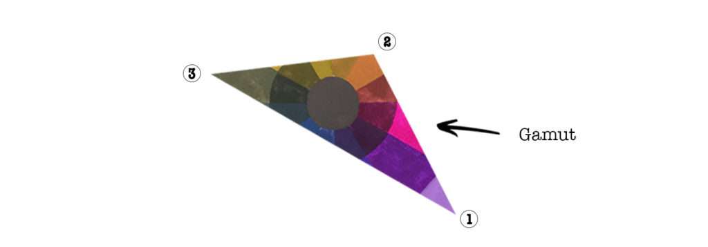 – pour le choix des 3 couleurs, on « peut » utiliser des couleurs dégradées comme rabattues à l’intérieur du Gamut. c’est le but en fait.