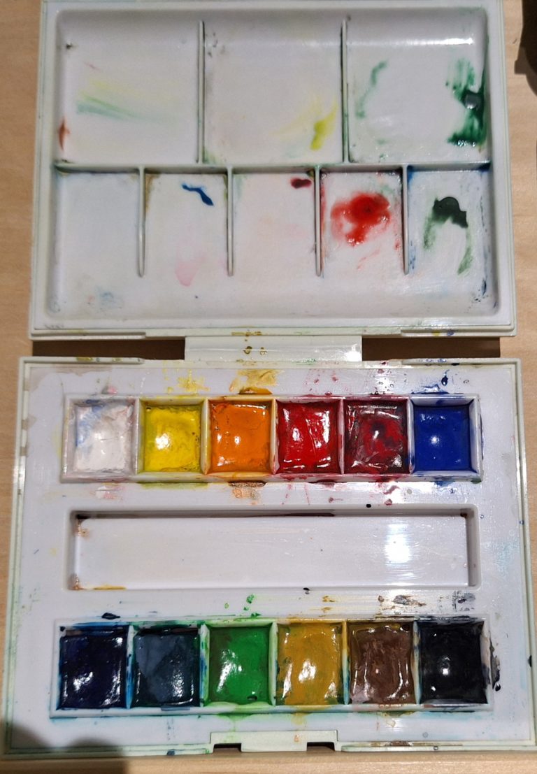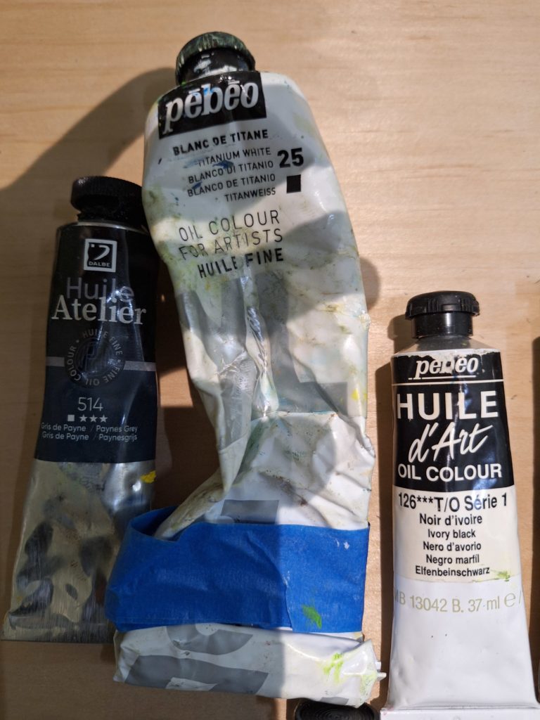jaune de Naples, bleu turquoise, vert cadmium imit, violet d’orient, gris de payne, jaune cadmium moyen, bleu de prusse, bleu ceruleum, jaune cadmium foncé, ocre jaune.