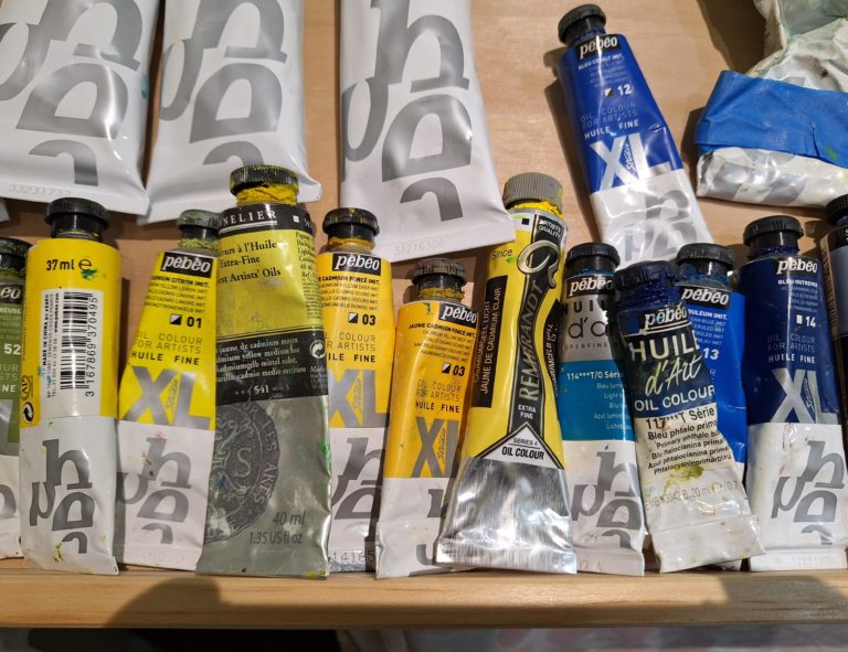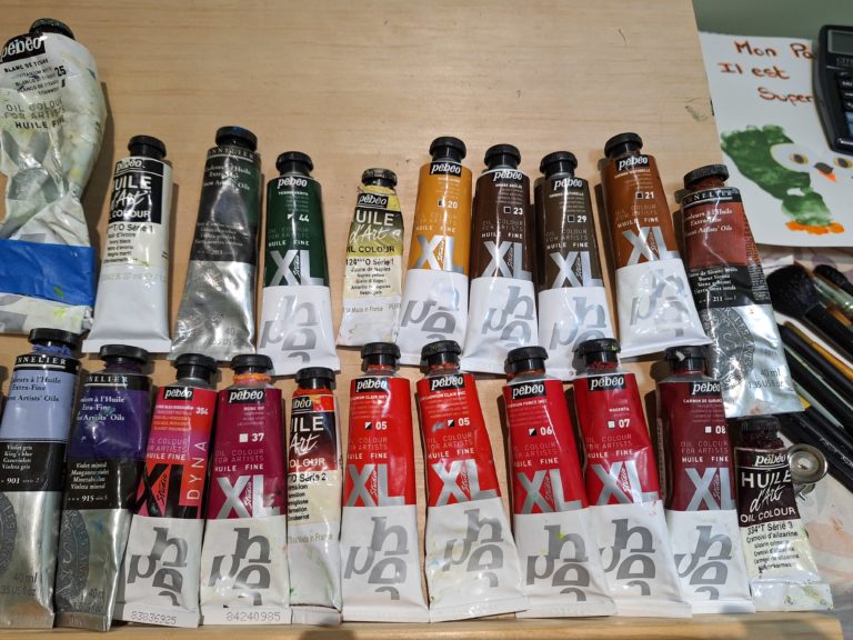 Joanaa. Je vous ai joint mes couleurs en fichier joint. A l’huile la plus utilisée est le blanc pour les dégradés et obtenir l’opacité. Mes préférées le jaune cadmium moyen. Le bleu de cobalt et la sienne brûlée pour realiser les mélanges. Sinon le vert de vessie ou les terres d’ombre verdâtre. Le cramoisie d’alizarine . Je suis plutôt paysage actuellement. J’ai une question concernant les gammes chromatiques. On n’utilise plus les terres d’ombre brûlée ou verdâtre par exemple pour les ombres…..on va chercher les ombres ou les gris uniquement dans la gamme. Dites moi si je me trompe. Pour l’huile j’utilise des toiles sur châssis. Et pour l’aquarelle je me suis doté d’un papier arche 300gr A3 grain fin pressé à froid 100% Cotton…je pense suivre les cours avec ce medium. Pour les couleurs que j’utilise le moins. Le noir. L’ombre naturelle. Le magenta. Le cyan…..je pense que le nombre de couleurs dont je dispose n’est pas très minimaliste. J’ai expérimenté une gamme avec 3 couleurs dégradées 6 fois….on se rend vite compte du nombre de combinaisons important que cela offre…il faut prendre ce temps d’expérimentation indispensable . Par contre l’utilisation de la gamme n’exclue pas quelques dissonnances ?