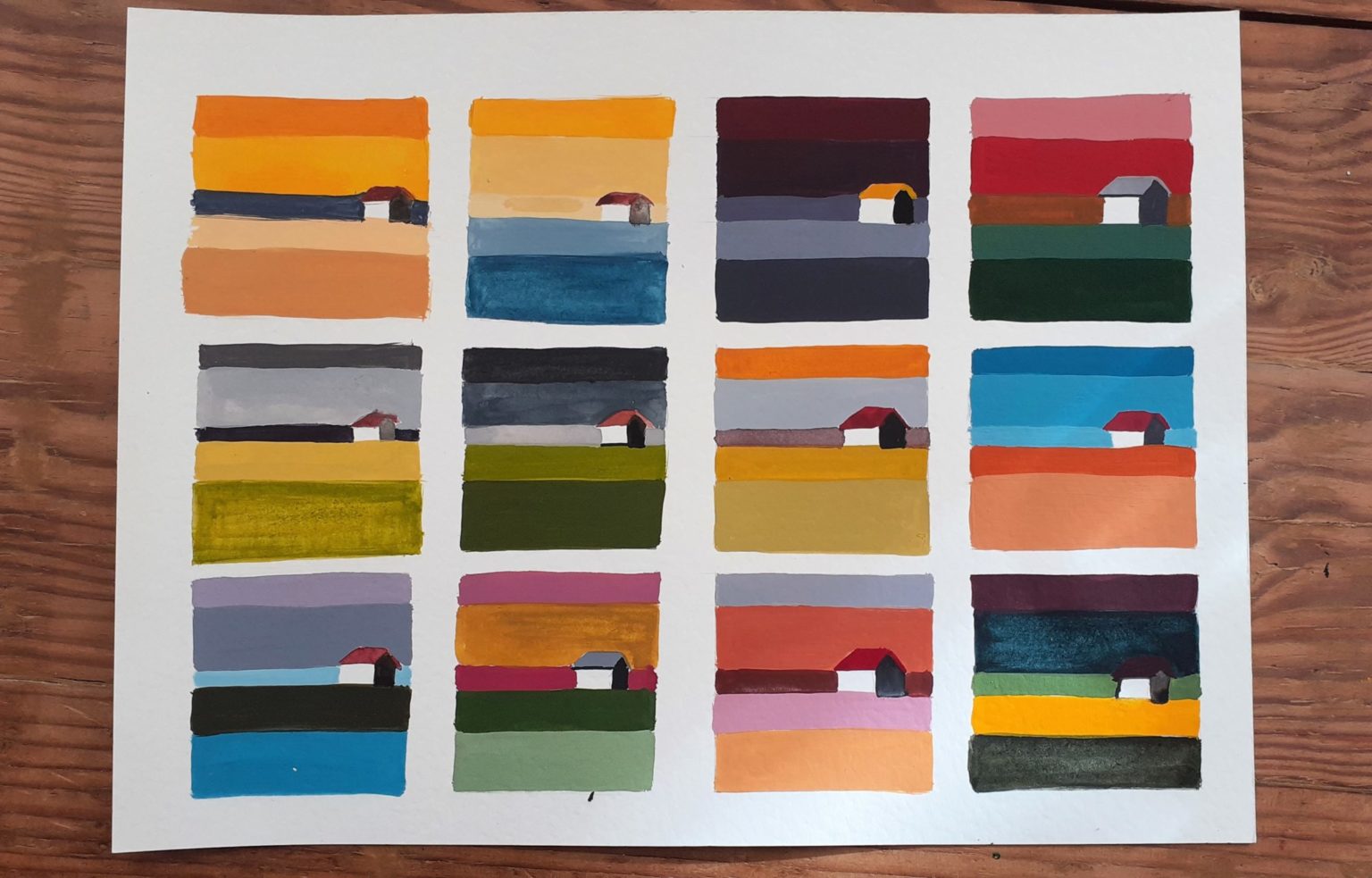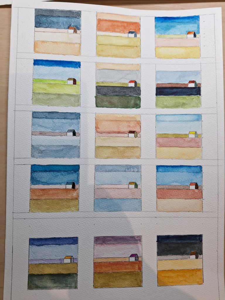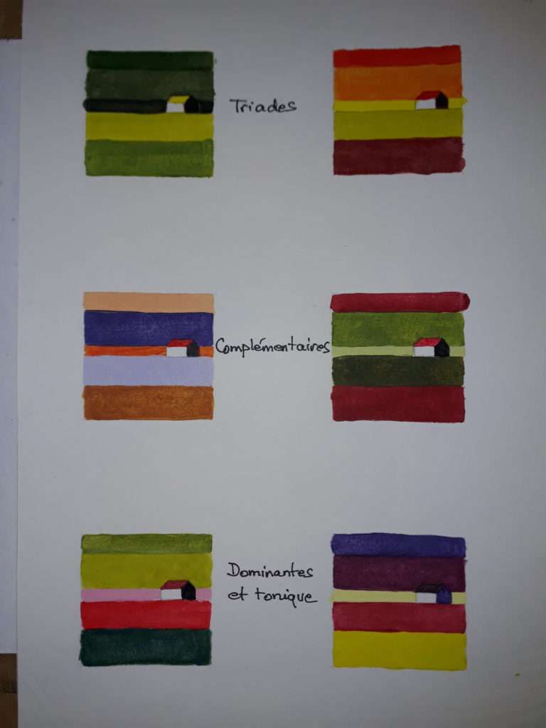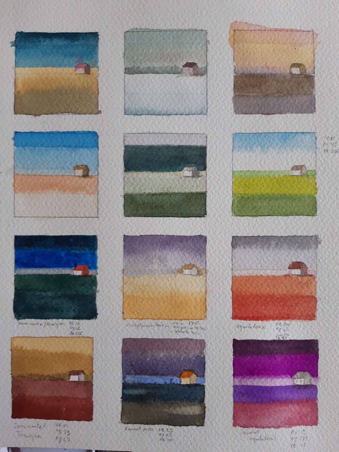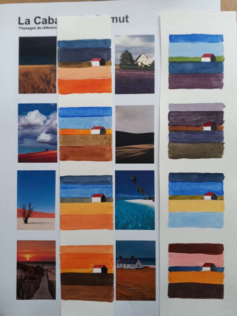 Les 6 premières cabanes sont inspirées des photos à partir de la roue chromatique ( pb15, py42, pr206) et de gamuts tracées Les 3 suivantes à partir des 3 gamuts. Les 3 derniers sont des essais à partir de roues chromatiques différentes. J’adore celui qui fait paysage de neige et l’association complément mauve et ocre.