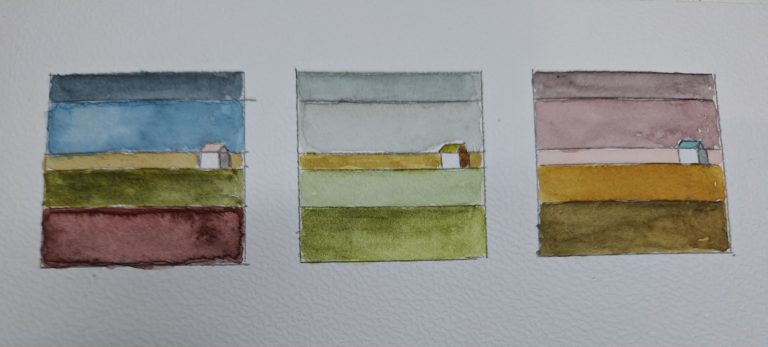 Mes préférences : la 3 ème et 4 ème images sur le damier qui me semblent harmonieuses et paisibles. J’aime moins la 9 ème, avec un ciel verdâtre pas très réaliste. Je me suis servi des 3 gamuts pour les 12 dessins, sans pouvoir vous préciser lequel pour tel ou tel dessin.
