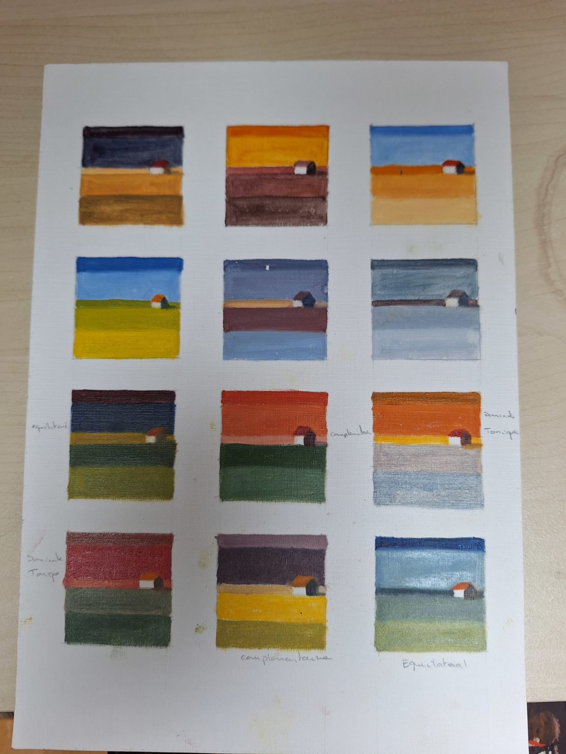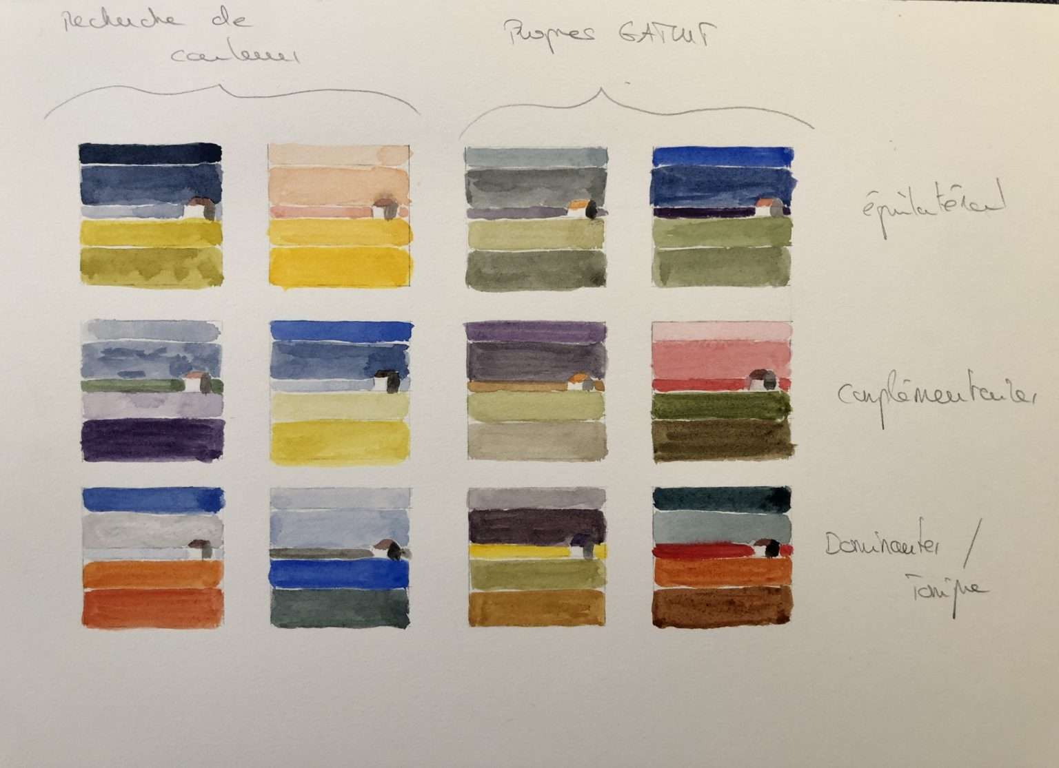 J’avoue ne pas avoir tout compris dans cet exercice, (cela doit être dû à mon côté psychorigide), et je suis sans doute hors sujet dans quelques réalisations. J’ai pris également quelques libertés dans l’éxécution des cabanes gamut (j’ai employé des teintes plus claires ou plus foncées que celles de mon cercle chromatique). Malgré tout, cela reste des exercices et il y a toujours quelque chose à apprendre de ses erreurs.
