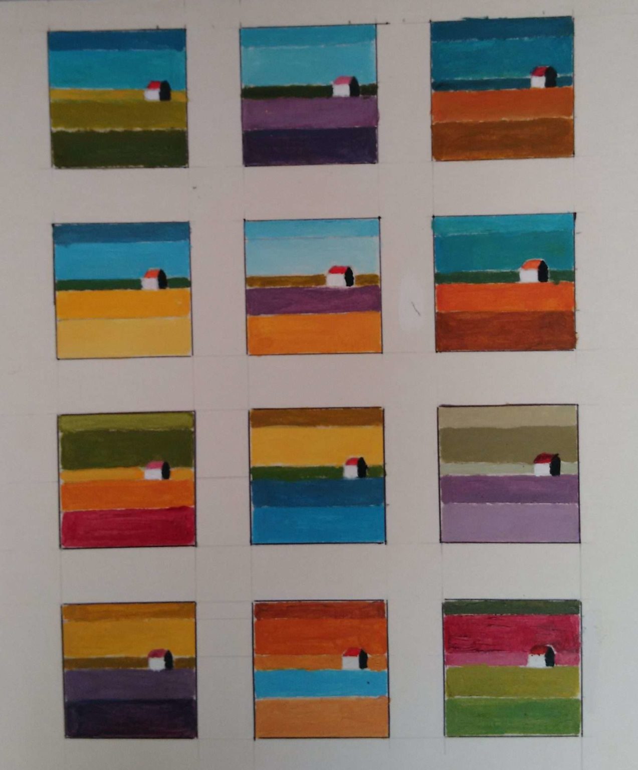 Voici quelques essais de cabanes… certains essais sont « sages », d’autres un peu plus libres voir parfois improbables. Je me rend compte en isolant chacune d’entre elles (côte à côte, elles se « répondent » beaucoup et s’influencent) que les harmonies colorées fonctionnent et ça me plait puisque c’était l’objectif de la formation ;-). En revanche, le travail que cela ouvre me paraît ici colossal car exponentiel si l’on veut tout tester…