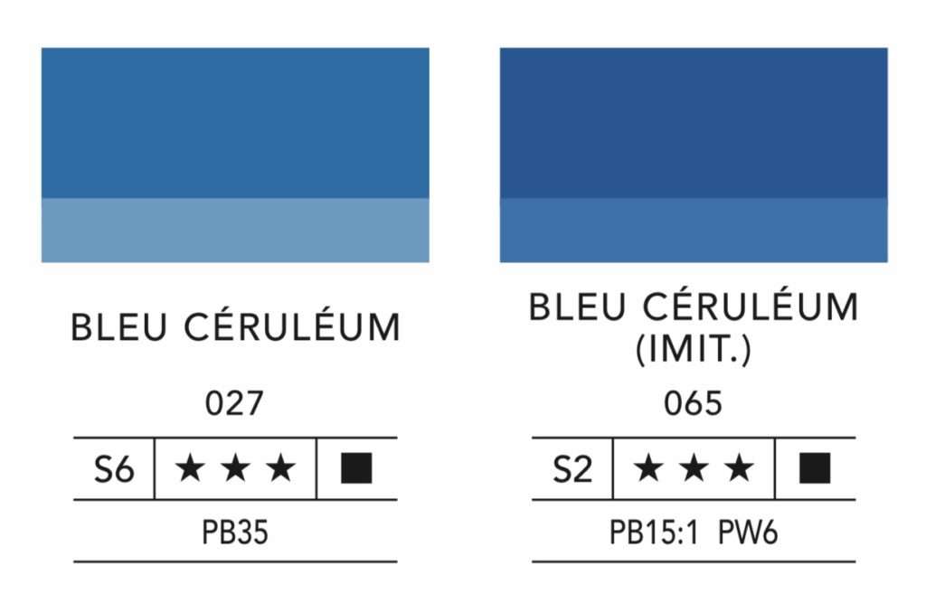 đ En Ă©tudiant les Ă©tiquettes de ces deux bleus, on constate que dans le Bleu CĂ©rulĂ©um d’imitation (Ă droite), le pigment minĂ©ral initial ( normalement Ă base de Cobalt) est remplacĂ© par un pigment Phtalo, organique de synthĂšse (PB15:1), (pigment trĂšs transparent et qui ne granule pas comme le Cobalt).