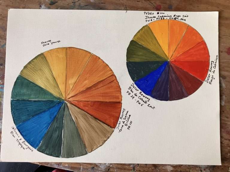 J’ai testé des gammes sans rouge pure mais avec de la terre d’ombre brûlée qui a du pr101. Parfois sans jaune mais avec du verre de vessie identifié py110 ou un or vert py129. J’ai parfois mal reproduit des mélange supposés identiques. Parfois…souvent même je pense que je mets trop d’eau…belle expérience en tout cas
