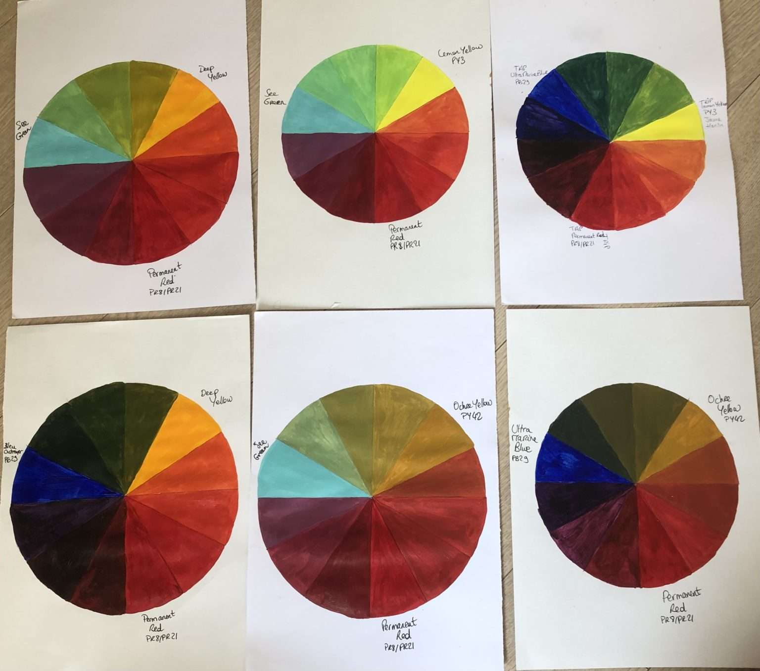 Voici encore deux cercles chromatiques ( toujours en acrylique) que j’ai pu faire avec les dernières primaires dont je disposais. J’aime bien la gamme colorée du plus grand cercle. Ce sont les tons que je recherche d’habitude dans mes créations.