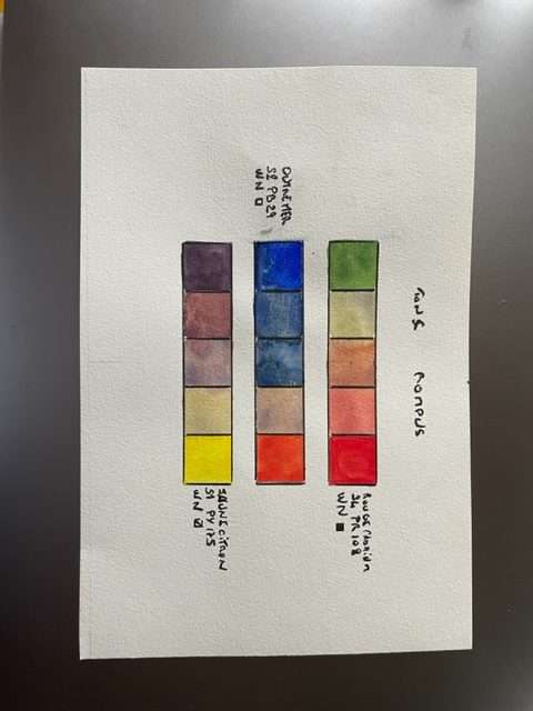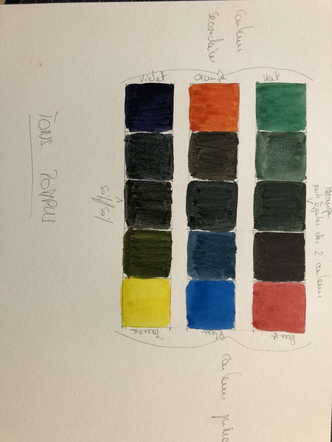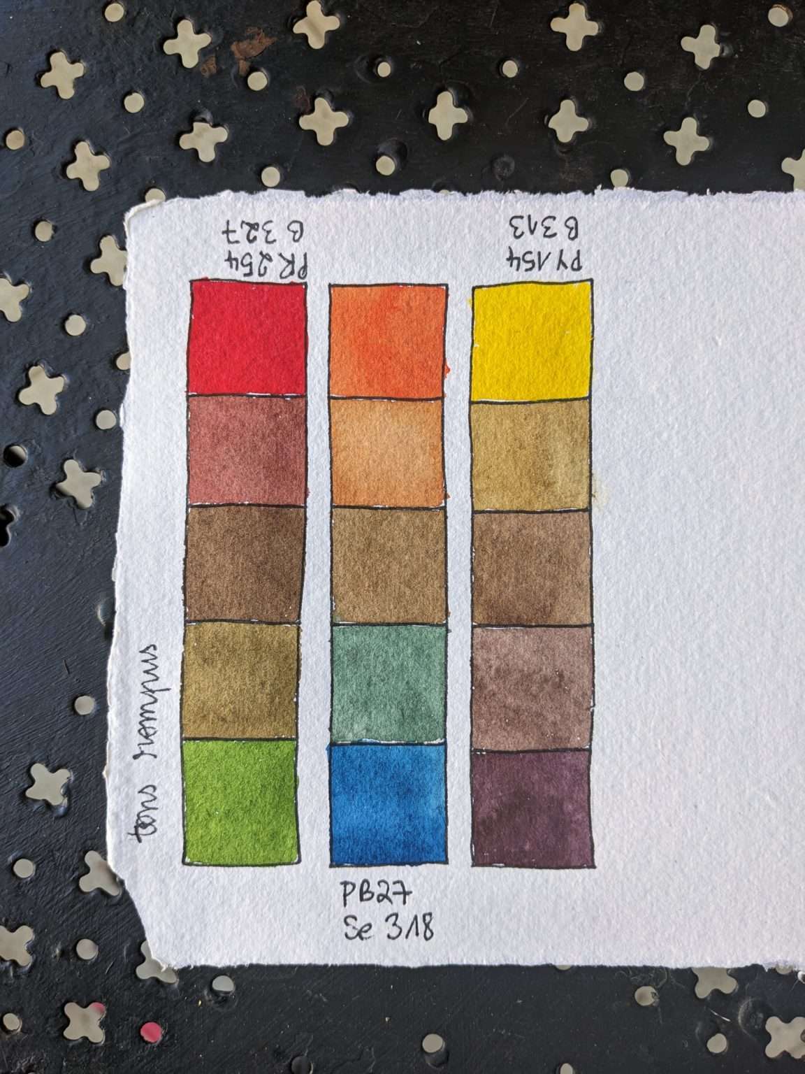 Bonjour, avec un peu de retard voici mes tons rompus ! En aquarelle, je suis partie de trois couleurs primaires PY154 PB27 et PR254, j’ai fabriqué les couleurs secondaires à partir de celles ci. Exercice intéressant ! Cela donne envie d’expérimenter à partir du moins de couleurs possibles, on sent que les possibilités sont immenses ! Merci !
