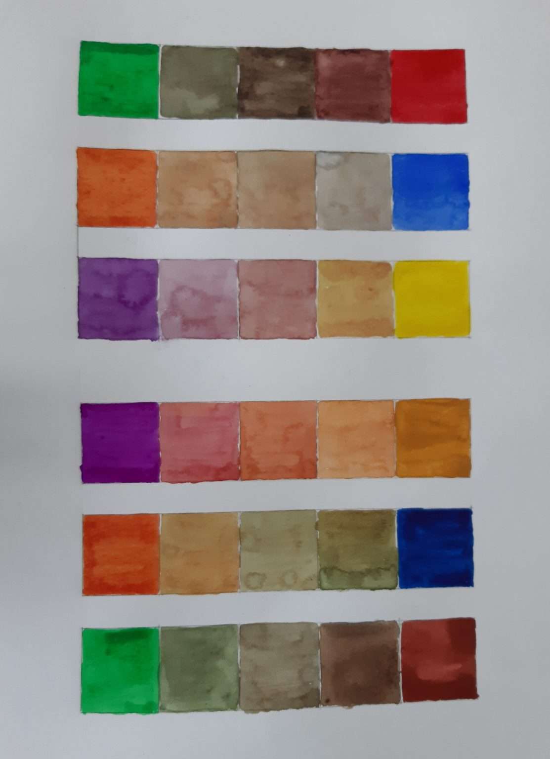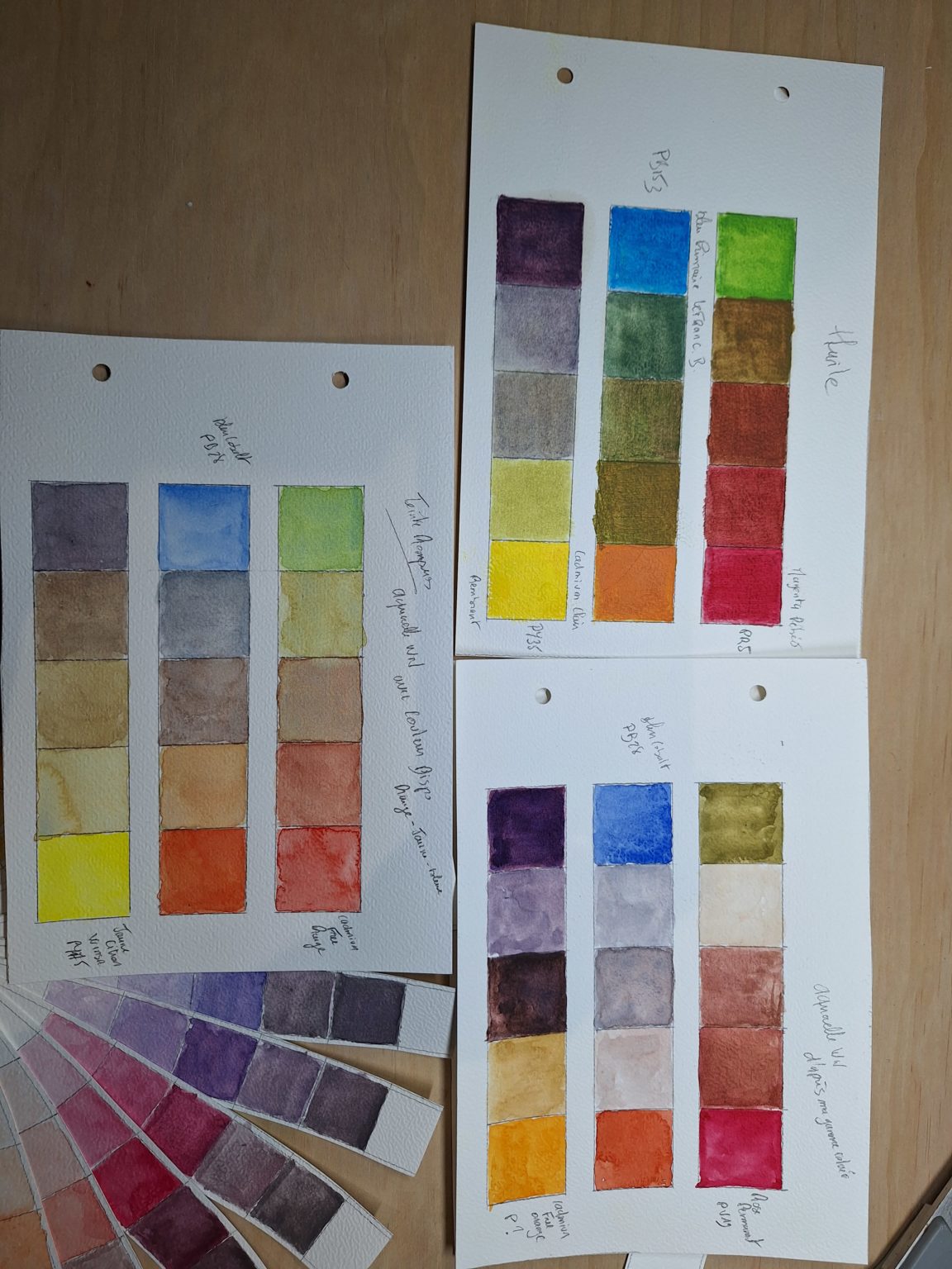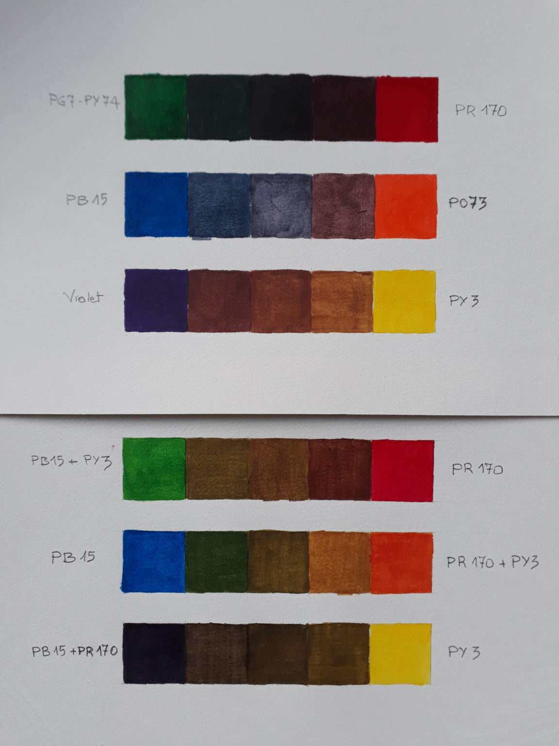 Bonjour, avec un peu de retard voici mes tons rompus ! En aquarelle, je suis partie de trois couleurs primaires PY154 PB27 et PR254, j’ai fabriqué les couleurs secondaires à partir de celles ci. Exercice intéressant ! Cela donne envie d’expérimenter à partir du moins de couleurs possibles, on sent que les possibilités sont immenses ! Merci !