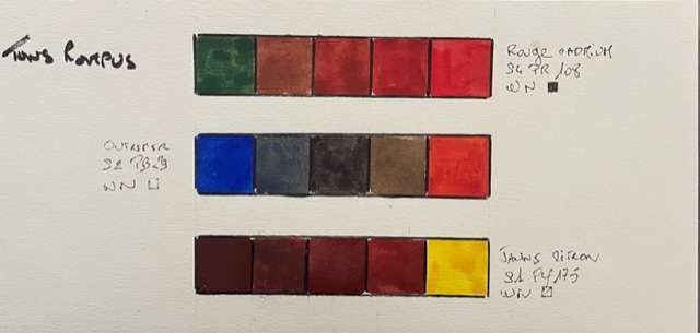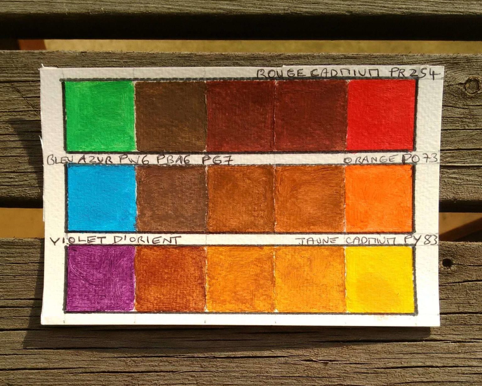 Voici mes couleurs de tons rompus à l acrylique. N ayant pas de orange je l ai recréé. Mon rouge n est pas mono pigmentaire, quant au vert je n’en ai aucune idée.